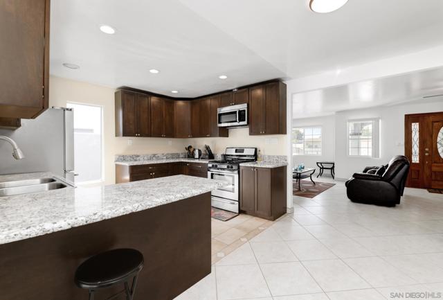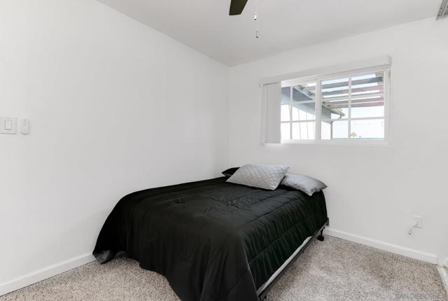 ENTERTAINERS DELIGHT!! Single-story 1,710 sq ft home on a quiet cul-de-sac tip, set back from the main road. 1261 Helix is planted on a flat street, but the rear property line sits above a bluff with 180° unobstructed views—city lights at night, neighborhood below, and wide-open sky by day. The back yard is huge and tailor made for a good kickback, a birthday or a Superbowl party. Inside: dual-pane vinyl windows and sliding doors throughout. Tile floors in kitchen, living, and traffic areas; carpet in bedrooms. Every room has a new ceiling fan with remote. Large living room with oversized fireplace. Open kitchen features granite counters, stainless steel appliances, and direct sightlines to living and dining spaces—ideal for hosting. Dedicated laundry room. Full interior and exterior repaint completed. Outside: fully gated with rolling front gate. Wide main driveway plus separate RV driveway runs full length of the house to rear patio. Back patio is poured concrete with pergola cover. Entire front and back yards upgraded with pet-grade artificial turf—dense, durable, and low-maintenance, stays bright year-round. 6-ft wood privacy fencing encloses the full perimeter. Leased solar panels cover 100% of the current owners’ annual electric bill. Location balances seclusion with access: minutes to I-805, shopping, and daily needs in Chula Vista, yet traffic noise is minimal. Practical, updated, and positioned for views, parking, and privacy. VA approved all day. The perfect mid sized Single Family Home at a great price.