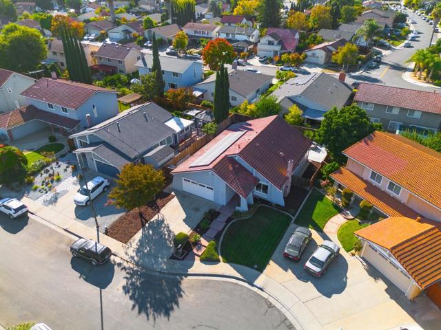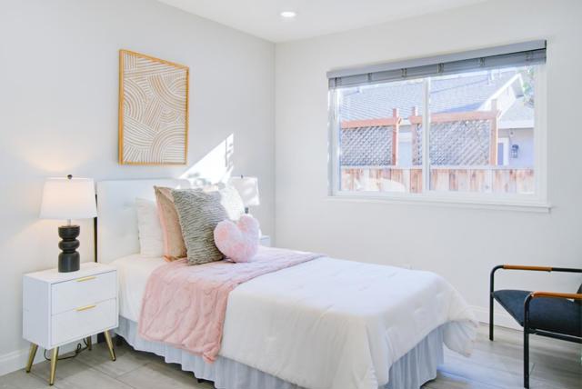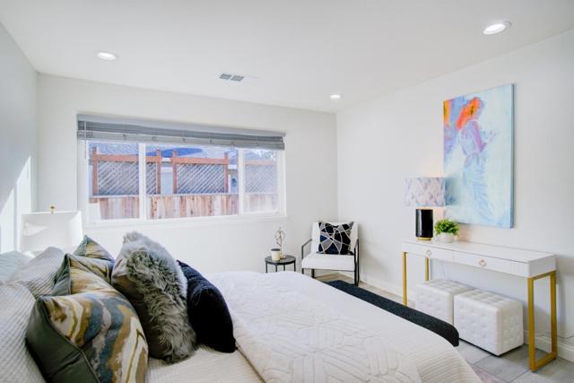 Welcome to 4399 Pitch Pine Court a 4-bedroom 2-bath Contemporary Ranch tucked into a quiet cul-de-sac in the Blossom Valley neighborhood of South San Jose. A brick walkway and freshly mulched front landscaping create inviting curb appeal. Inside, wide plank laminate flooring, vaulted ceilings, dual-pane windows, and an open layout reflect a modern Mid-Century aesthetic with natural flow between social and private areas. The step-down living room with fireplace connects seamlessly to an open-concept kitchen and casual dining area. The kitchen features Quartz countertops, custom Shaker Style soft-close cabinetry in a two-tone palette, and a contrasting island with seating, while solar panels enhance the homes modern efficiency. Sliding doors open to a spacious backyard with a large patio, vibrant lawn with automatic sprinklers, and a mulched garden border. The bedroom wing includes a primary suite with ensuite bath, plus three additional bedrooms, one of which features double doors offering flexibility of use, and a hall bath. The finished oversized two-car garage includes epoxy flooring and laundry hookups. Conveniently located near Santa Teresa County Park, Westfield Oakridge, and commuter routes 85 and 101.