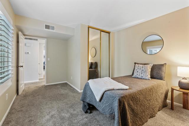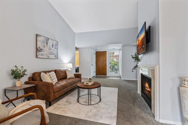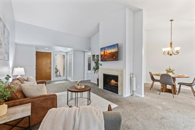Gorgeous 2-bedroom, 2-bath home with a den that can easily serve as a 3rd bedroom. The welcoming front courtyard opens to a bright, airy living room featuring vaulted ceilings, a gas log fireplace, wall mounted flat screen TV, and picture windows that fill the space with natural light. The remodeled kitchen shines with abundant cabinetry, quartz countertops with backsplash, stainless steel refrigerator, and laminate flooring. The spacious primary suite offers two mirrored closets and a slider to the private back patio, while the ensuite bath features a double-wide stall shower. Additional highlights include a new roof, new electrical panel, dual-pane windows, plantation shutters, and neutral tones throughout. Enjoy the community pool and clubhouse, shady patio with pergola, perfect for entertaining and a finished garage with washer and dryer.