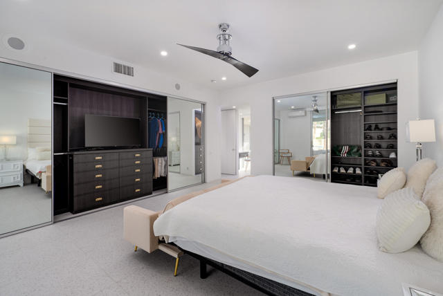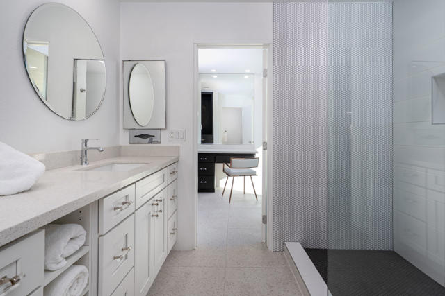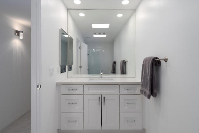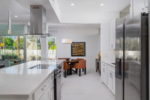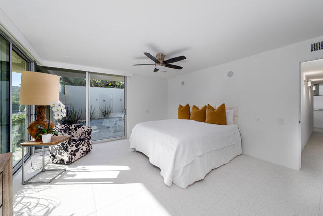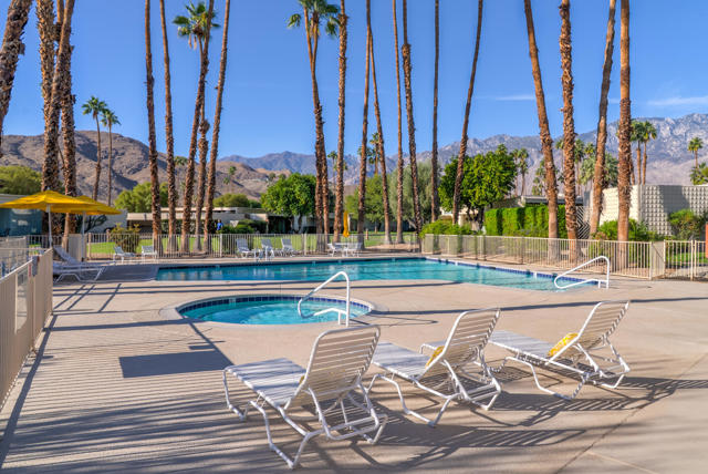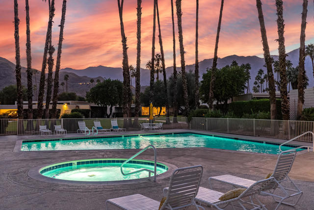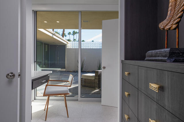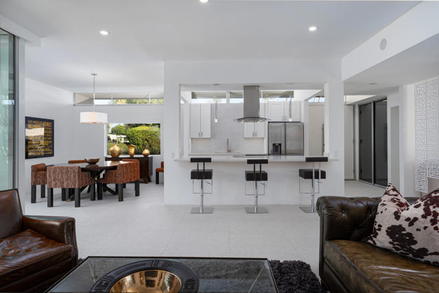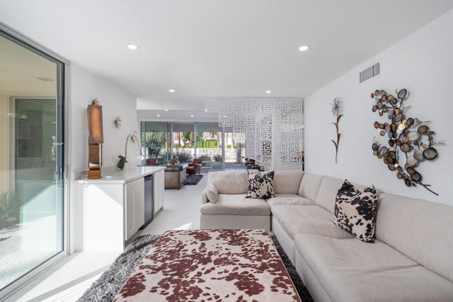 A beautiful renovation with perfect upgrades await, in this 2 bed/2 bath + den in the sought after Seven Lakes Country Club. Originally designed by architect Richard Harrison in 1967, this modernist villa features 10 ft floor-to-ceiling walls of glass, including newer dual paned windows with electric shades and clerestory windows. The open kitchen features custom cabinetry, quartz counters and gleaming stainless appliances. With terrazzo tile floors throughout, this home also has an extended dining area and living room fireplace, creating a perfect entertaining space. Additional features include new bathroom vanities, a walk in laundry room, and updated water heater, electrical and HVAC systems. Your two gorgeous outdoor spaces include a leisure terrace facing a large sparking pool and stunning San Jacinto views or step out onto one of the largest private courtyards in the complex, featuring new desertscaping. The newly recoated roof with a 5 year transferable warranty is included, for your convenience. Past the 24-hour guarded gate, 'The Gem of the Desert' offers a unique elevated lifestyle with its Ted Robinson-designed 18-hole executive golf course, 15 pools and spas and lively William Cody designed clubhouse waiting to greet you to its formal dining room, casual cocktail lounge and a terrace overlooking the famous Seven Lakes fountain. Welcome home!