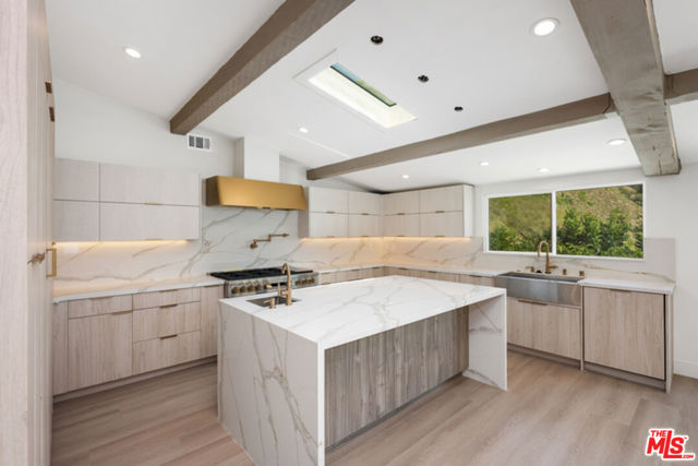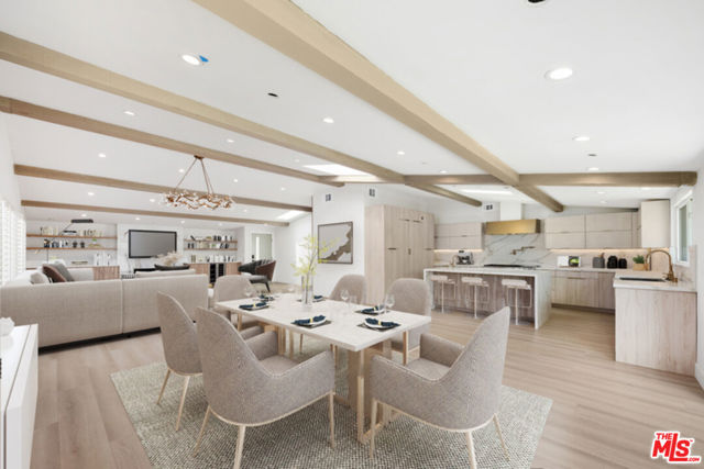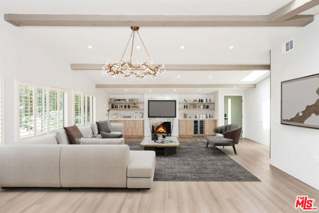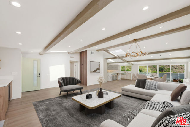 Gorgeously remodeled one story home with artistic details that offers comfort and, convenience situated in coveted Marquez Knolls of Pacific Palisades. The open floor plan includes a cozy living room with a beautiful fireplace, cabinetry and bar. The dining area features an elegant chandelier, skylights and opens to the family room with French doors to the side yard. The Chef's kitchen includes new cabinetry, new appliances, Subzero refrigerator and a waterfall island. The Master bedroom has a walk-in closet and a new large wardrobe closet as well as a beautiful new bathroom with elegant lighting. The extra 3 bedrooms have nicely sized new closets. The 2nd bathroom is completely remodeled, and the 3rd bathroom has been newly added. Spacious backyard. Located close to Saint Matthew school.