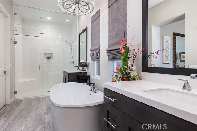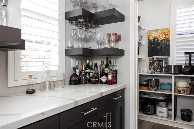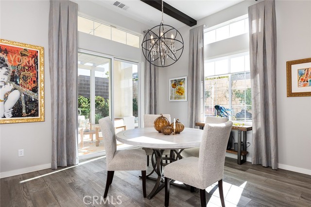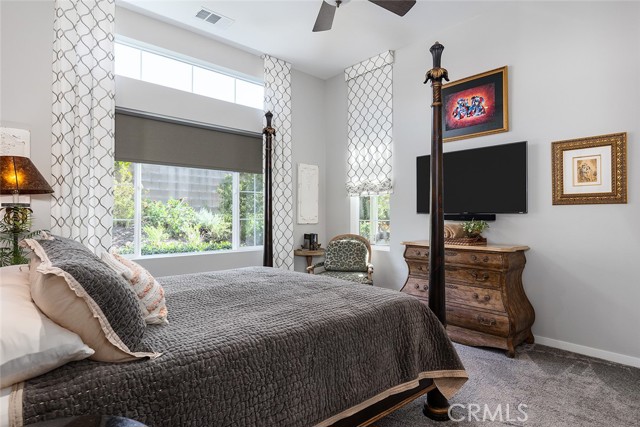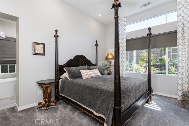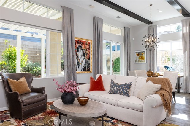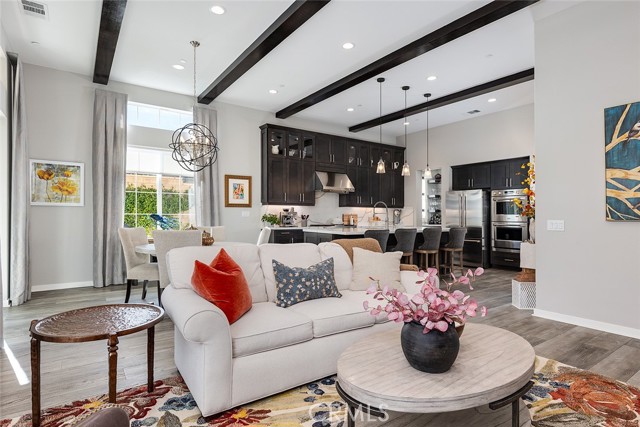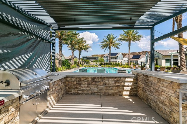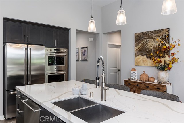 Set on a premier corner lot in the highly desirable Verano at Aliento community of Santa Clarita, this stunning single-level residence combines sophisticated design, luxury upgrades, and effortless indoor-outdoor living! The open-concept floor plan features two private bedroom suites plus an elegant guest powder room. The gourmet kitchen is a chef’s dream—upgraded with GE Monogram stainless steel appliances, including a double oven, four-burner gas cooktop with griddle, quartz countertops with matching backsplash, and an artisan Chef Pro sink. Stacked upper cabinets with glass doors, under-cabinet lighting, a butler’s pantry, and a walk-in pantry with custom built-ins provide exceptional storage. A spacious quartz center island anchors the kitchen, offering the perfect gathering place for cooking and conversation. The great room showcases dark wood-beamed ceilings, a gas fireplace and custom built-in cabinetry, and transitions seamlessly through a two-panel sliding glass door to a very private professionally landscaped backyard—ideal for entertaining or relaxing in style! Extra outdoor details include professionally installed Trimlights, drip irrigation and two separate gas lines for a firepit and BBQ. Nestled adjacent to the Golden Valley Open Space, Verano at Aliento celebrates the best of the California lifestyle with miles of scenic trails, parks, and walking paths. This double-gated, age-restricted community offers residents access to two resort-style community centers, featuring pools, spas, fitness facilities, and clubhouses. This is California living at its finest—welcome home to Verano at Aliento!