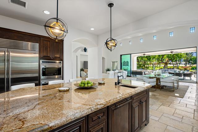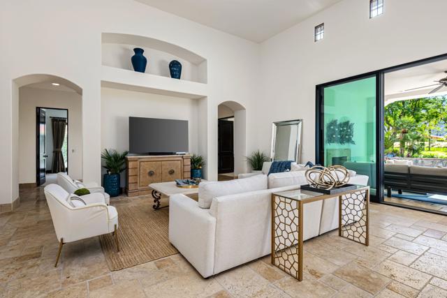 Experience luxury desert living at Tradition in this stunning south-facing residence overlooking the 4th hole with panoramic mountain views. This beautifully designed home features four bedrooms plus an office, offering an ideal blend of comfort and sophistication. The freshly painted interior complements the spacious great room floor plan, which includes a cozy fireplace and elegant dining area. New tall stacking slider doors create a seamless indoor-outdoor flow, opening to the inviting outdoor living room with built-in BBQ, sparkling pool, and spa, perfect for entertaining or relaxing under the desert sky. The gourmet kitchen boasts premium appliances and a temperature-controlled wine room, ideal for the culinary enthusiast. The office provides a peaceful retreat with tranquil views of the courtyard fountain. The primary suite offers a private sanctuary with a fireplace, breathtaking mountain vistas, and a luxurious spa-style bathroom featuring dual vanities, soaking tub, walk-in shower, and a spacious closet. Two guest suites in the main house provide comfort and privacy, while the detached casita, with French doors opening to the courtyard and fountain views, makes a perfect guest haven. Offered unfurnished.