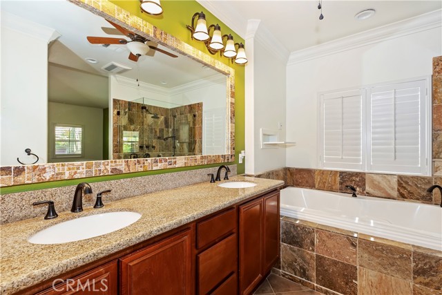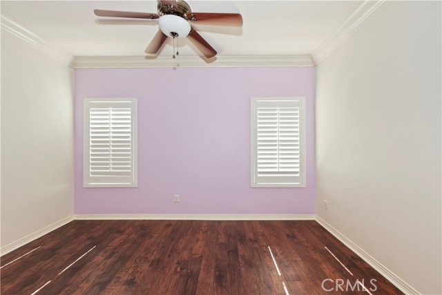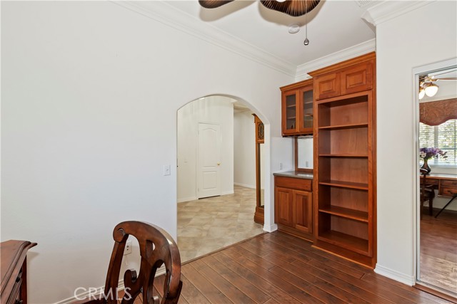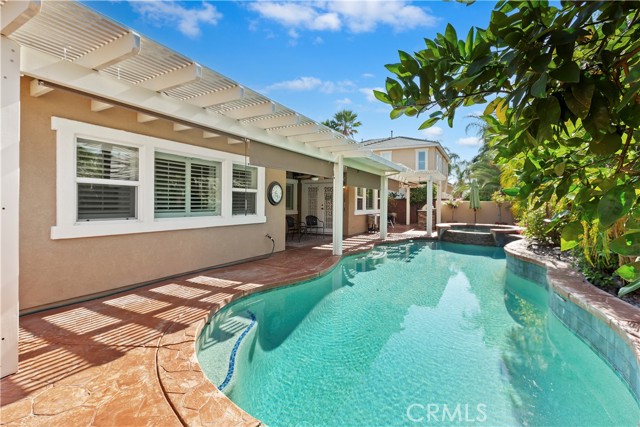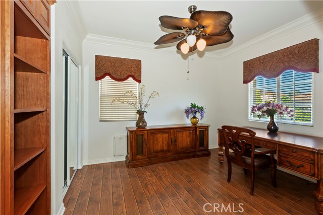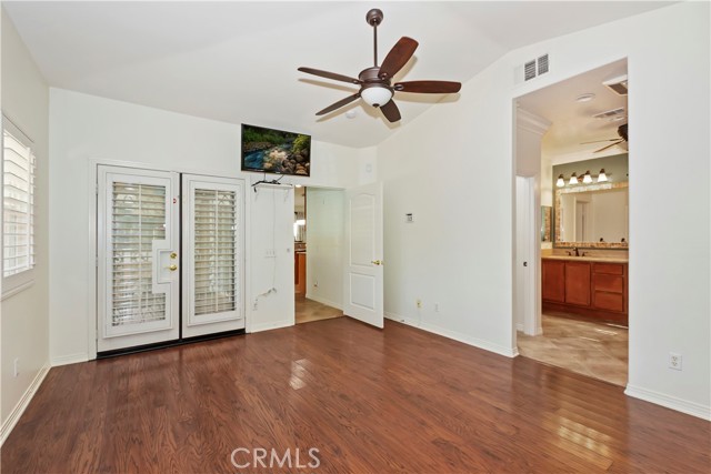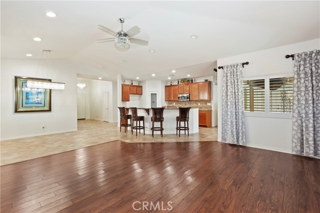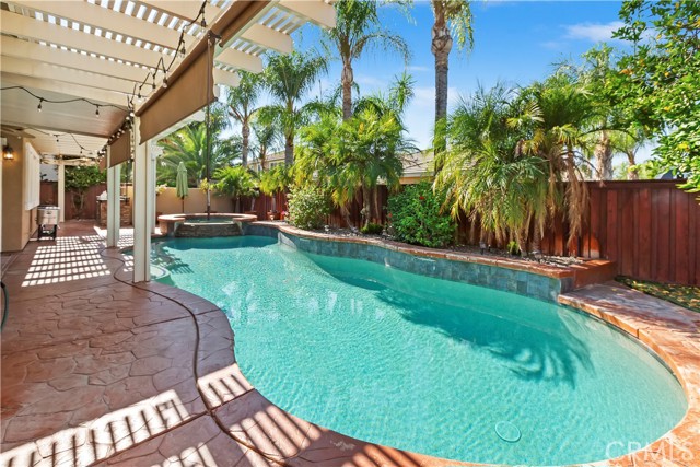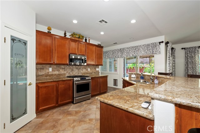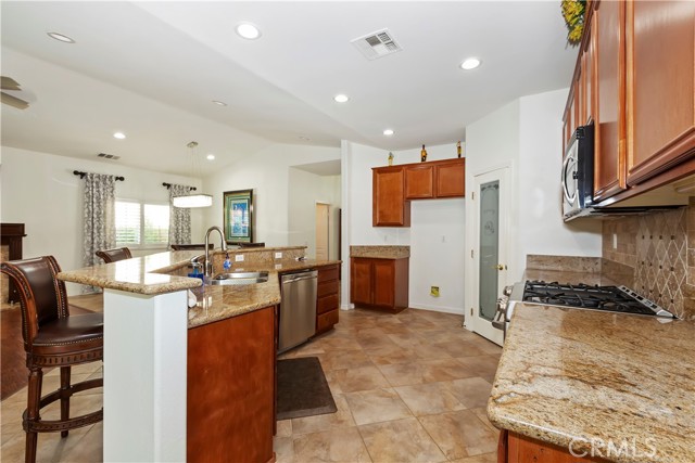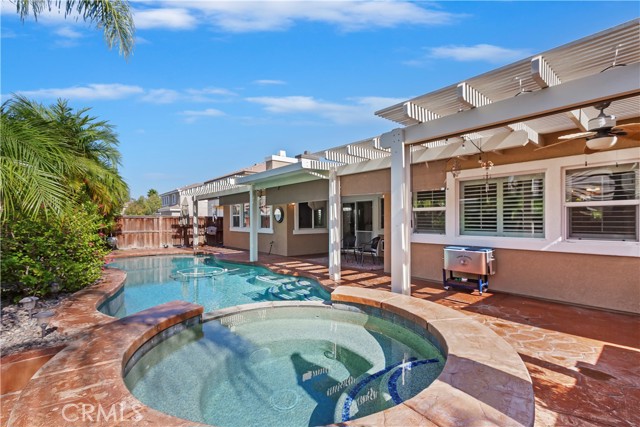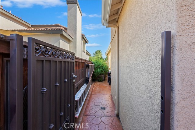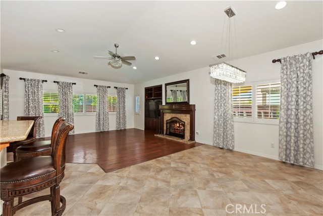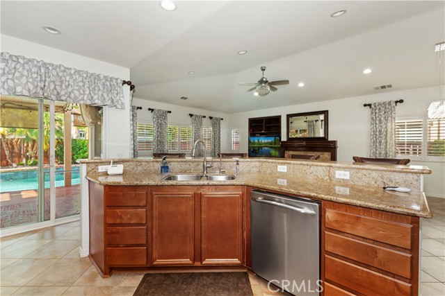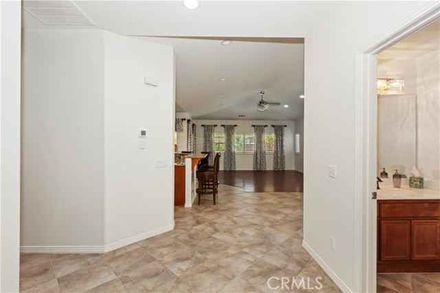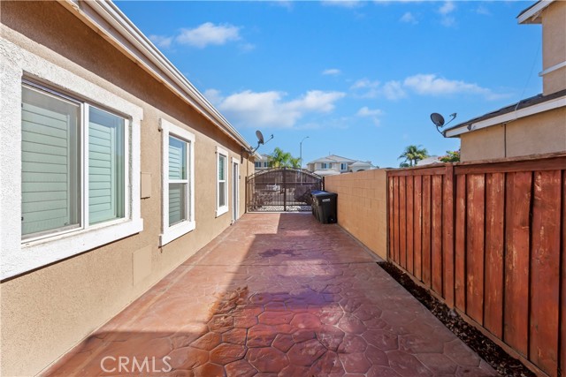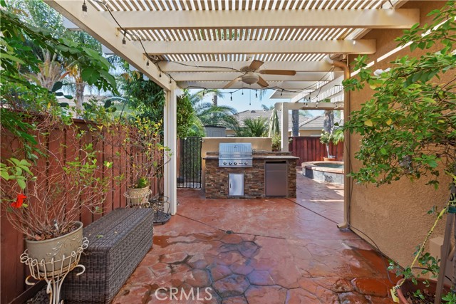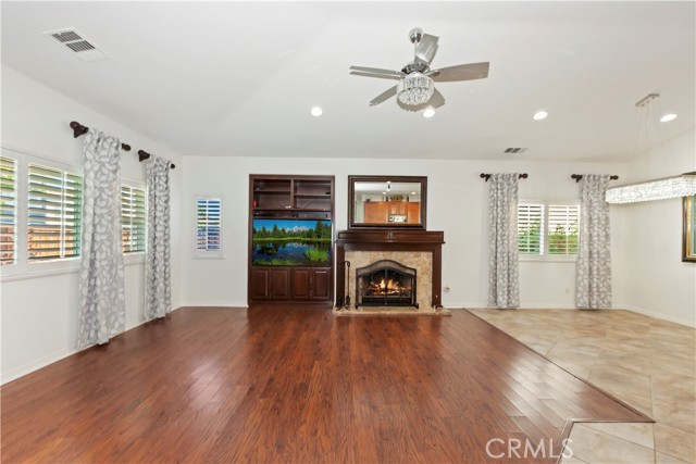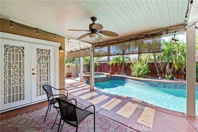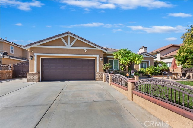Beautifully Upgraded Turnkey Home on a Quiet Cul-de-Sac in Menlo Estates, Hemet! This stunning single-story home offers 4 bedrooms and 3 bathrooms, thoughtfully upgraded throughout. Enjoy hardwood and tile flooring, recessed lighting, crown molding, plantation shutters and energy-efficient windows. A double-door formal entry welcomes you into the spacious, open layout. The private, gated front yard includes a charming porch—perfect for relaxing outdoors. RV parking with custom gates and a large driveway provide plenty of space for vehicles and toys. The entertainer’s backyard is a true highlight, featuring a sparkling saltwater pool and spa, a full wrap-around covered patio with stamped concrete, a mounted TV (included), and a BBQ island with a stainless steel refrigerator and 4-burner grill. Inside, the living room offers a cozy fireplace, built-in entertainment cabinetry, and a mounted TV (included). The kitchen boasts a large center island with bar seating, a spacious pantry, stainless steel appliances and an open-concept design ideal for gatherings. The primary suite offers a large walk-in closet, soaking tub, walk-in shower, and dual sinks—with a mounted TV included. The front bedroom has been converted into a home office but can easily be restored to a bedroom if desired. Additional features include a large laundry/utility room, a two-car garage with pull-down ladder and attic storage, soft water system, tankless water heater and no HOA. Schedule your private tour of this beautiful Menlo Estates home today!