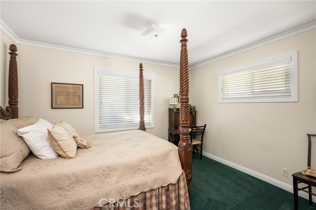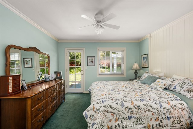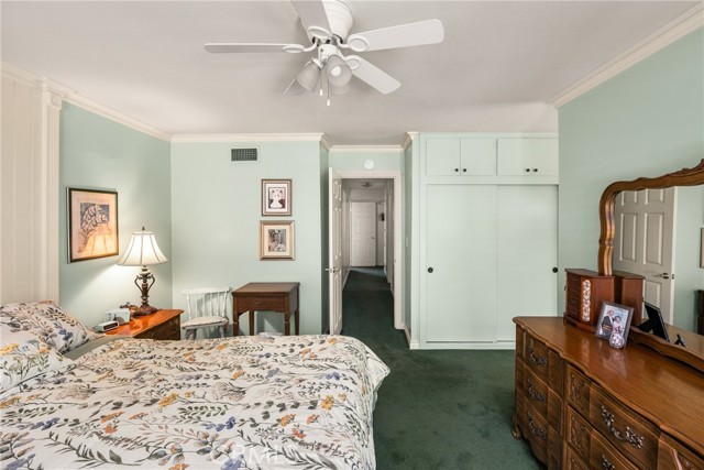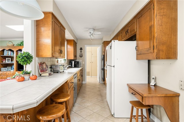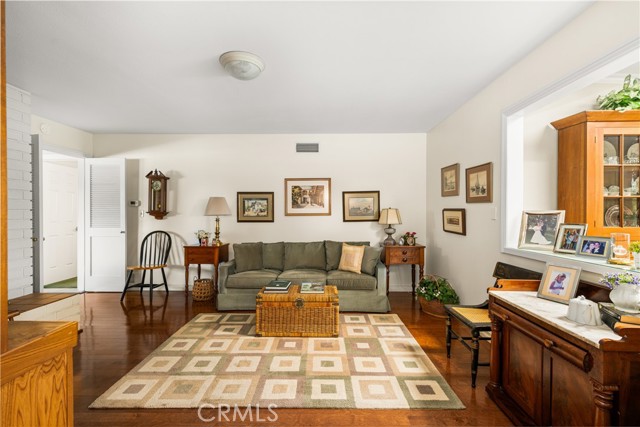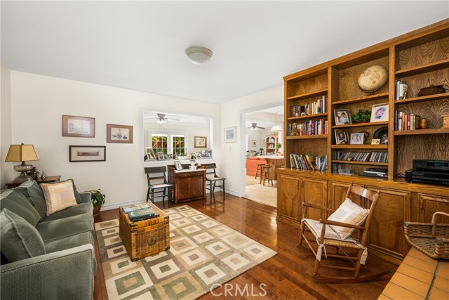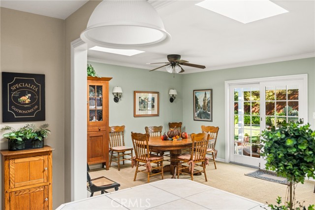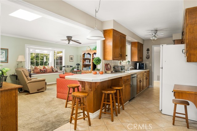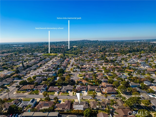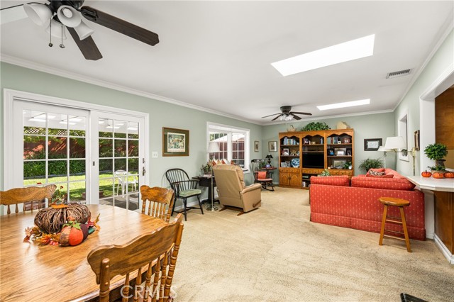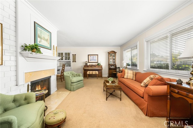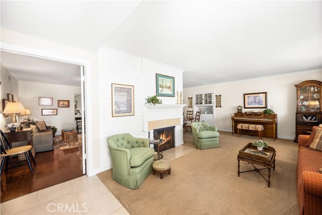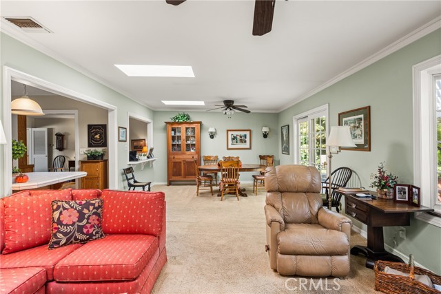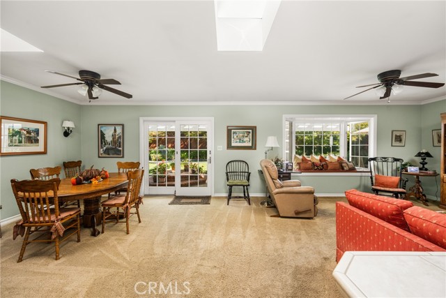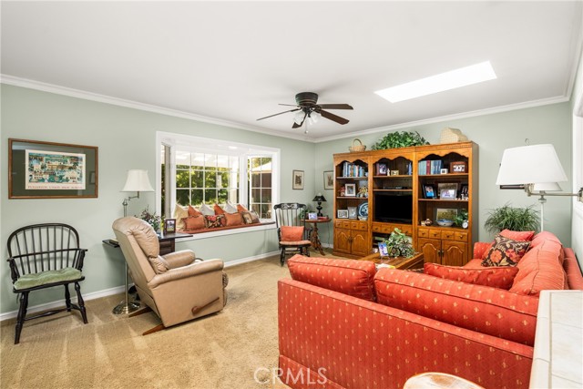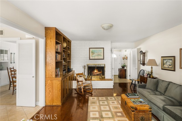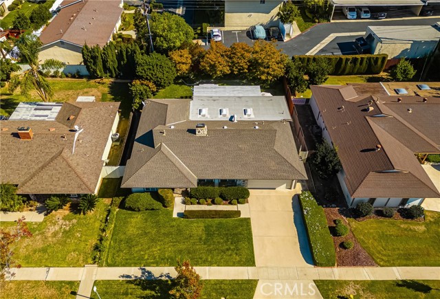 This beautiful single-story home is located in the middle of the most popular President homes neighborhood of Fullerton. The original floorplan included 3 bedrooms, 2 bathrooms, separate den, a formal dining room, and 2 fireplaces. The primary en-suite included a dressing area and separate bathing area with stall shower. Since the original construction the bathrooms were remodeled, and a huge family room was added as the focal point of the home with 3 skylights, 2 lighted ceiling fans, sliding French doors and large bay window with a widow seat with views to the oversized shaded patio and the serene plush yard.