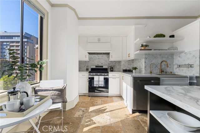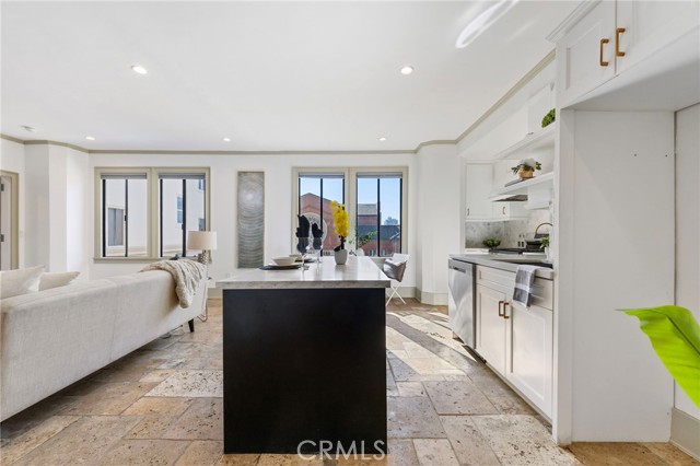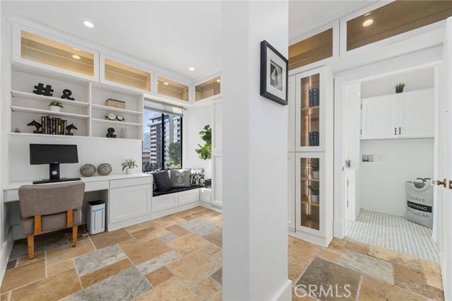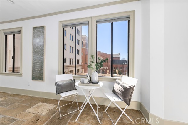 Discover a truly exceptional and unique residence in the iconic Willmore Building - a stunning, oversized unit created by merging two homes into one expansive and thoughtfully designed space. This remarkable property features an open floorplan wrapped in elegant stone floors, centered around a recently renovated kitchen with quartz countertops, a striking designer backsplash, an oversized eat-in island, and a charming brunch nook that flows effortlessly into the bright and airy living room. Large windows frame neighborhood views and fill the space with natural light. The two bedrooms sit on opposite wings for added privacy, with the primary suite tucked behind a hidden bookcase entry and offering its own full bathroom and large closet. The second bedroom, cozy yet beautifully appointed, includes custom built-ins, a window bench overlooking the city, and direct access to the in-unit laundry and a fully remodeled bathroom featuring a glass-enclosed shower, mosaic tile details, and abundant sunlight. The historic building features a lavish entry, a restaurant downstairs that offers owner discounts, a beautiful solarium, 360 rooftop terrace and dues cover all utilities (except cable/internet). All of this is just moments from Downtown Long Beach, The Pike, renowned dining, the beach bike path, the Queen Mary, and the best of coastal urban living.