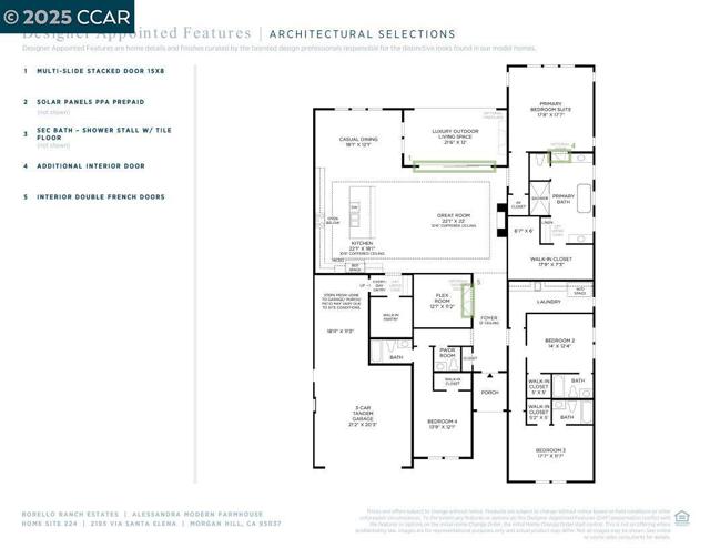 Set in a secluded location surrounded by Morgan Hill's soft rolling hills and open space, Borello Ranch Estates is a luxury gated community. Located at the southern tip of the Silicon Valley in Morgan Hill, an abundance of parks, golf courses, walking/biking trails, recreation centers and easy access to freeway and public transportations. An expansive great room is at the heart of this home. A welcoming foyer opens onto the great room with coffered ceiling, and multi-slide stacked door leads to desirable luxury outdoor living space beyond. Gourmet kitchen is open to a sizable casual dining area and features a large center island with breakfast bar, wraparound counter, modern cabinets, upgraded JennAir stainless steel appliances, 24" Beverage Center. Secluded primary bedroom suite are a generous walk-in closet and gorgeous primary bath with dual vanities, large soaking tub, luxe shower, linen storage, and private water closet. Secondary bedrooms feature roomy closets and private baths. A large flex room and monthly saving Solar Panels sytem and water softener. Enjoy the 7,000+sqft resort-style recreation center with impressive pool, spa, barbecue facilities, bocce ball/pickleball courts and many other amenities (Photo not of actual home/yard for marketing only) 4 homes left