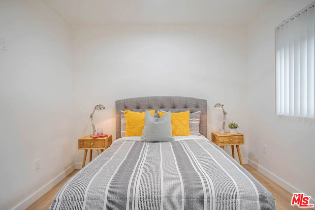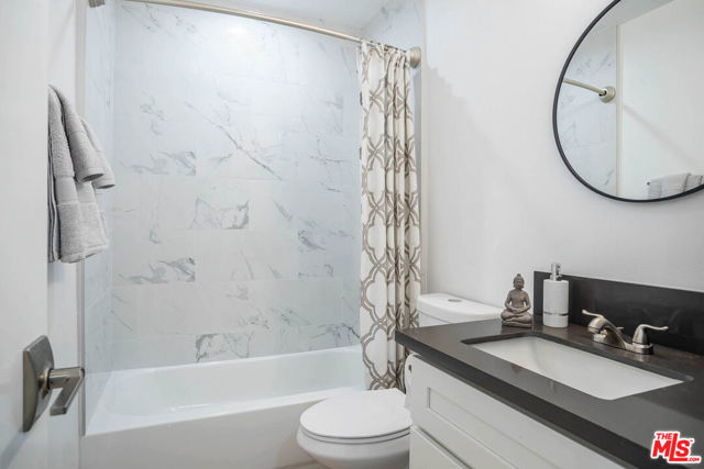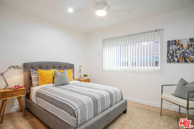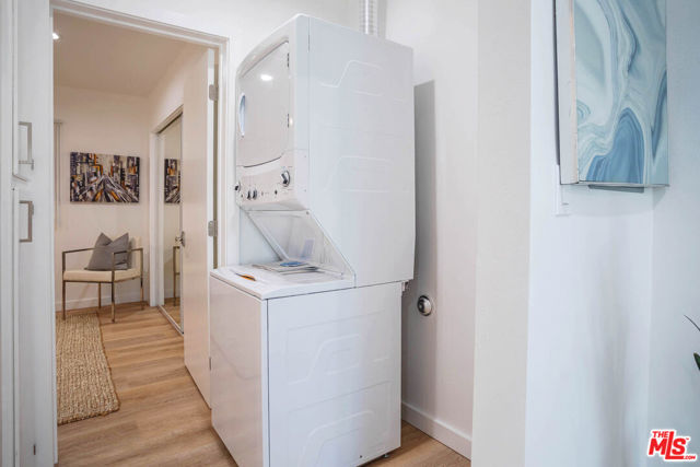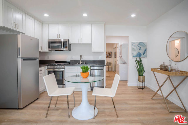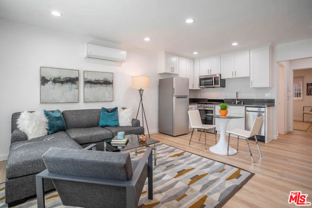 Hip, Cool and New totaly modernized gated Mid-Century one bed one bath available now in prime Hollywood location! Refreshed with new paint and new exterior finishes. Enjoy a TOP FLOOR unit with westward VIEWS of the city. Fabulous bright open floor plan features recessed lighting, hardwood style plank flooring throughout, expansive windows with new blinds, stylish lighting fixtures and your own laundry area with large stackable WASHER and DRYER. Kitchen has new quartz countertops, new fixtures, deep style sink and stainless steel appliances with new microwave, dishwasher, gas stove and refrigerator. Remodeled bath has shower/tub combo has custom tile, new lighting and stylish vanity. Large bedroom has modern ceiling fan with remote and closet with mirrored doors. Strong new minisplit AC/Heater with remote control. Security building with gated entry, cable ready internet and stylish accents. Street parking only (by residential permit). Large STORAGE bin included. PET OK. Near Netflix, Archlight Cinemas, Cinerama Dome and more. Dont miss it! **Please not apartment is staged and comes unfurnished.