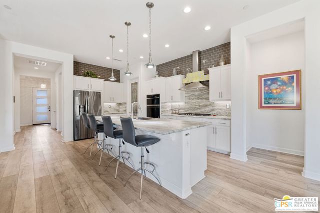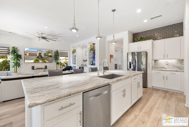 Resort-style living begins the moment you arrive at this beautifully upgraded "Preserve Model" in Del Webb Rancho Mirage - one of the desert's most desirable 55+ communities known for its vibrant social scene, clubhouse, fitness center, pools, pickleball, tennis, and more. Positioned to capture premier south-facing mountain views, this 2-bedroom PLUS den (or third bedroom) AND separate bonus room, 2-bath residence offers tall ceilings, an open floor plan, and effortless indoor/outdoor living. Designed for those who love to entertain, the gourmet kitchen shines with upgraded finishes, stainless-steel appliances, and a large walk-in pantry. The large detached island and adjacent dining area flow into the light-filled great room with a custom one-of-a-kind bar. You'll appreciate the multi-panel sliders framing the mountains. Step outside to a generous covered patio with tile flooring, fire-pit, commercial misting system, heaters, and remote-controlled sunshades ideal for year-round enjoyment. The private, low-maintenance backyard features an above-ground hot tub, putting green, and room to add a private pool or spa, all set against mountain views. The south-facing Primary Ensuite offers its own mountain views, a large walk-in closet, and a private bath with dual sinks and a walk-in shower enhanced with a bench and clerestory windows. Bedroom Two with adjacent bath is located on the opposite side of the home for excellent separation of space. The separate office/den adds flexibility and can easily serve as a third bedroom. Additional highlights include an interior laundry room, attached two-car garage, and a bonus room off the garage perfect for a workshop, wellness area, or hobby studio. A rare blend of luxury, lifestyle, and location ready to welcome its next owner.