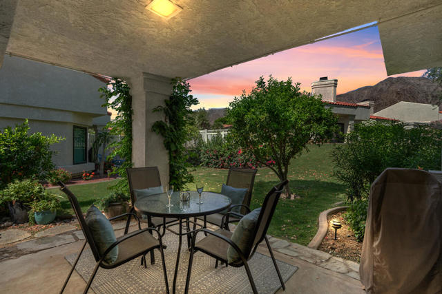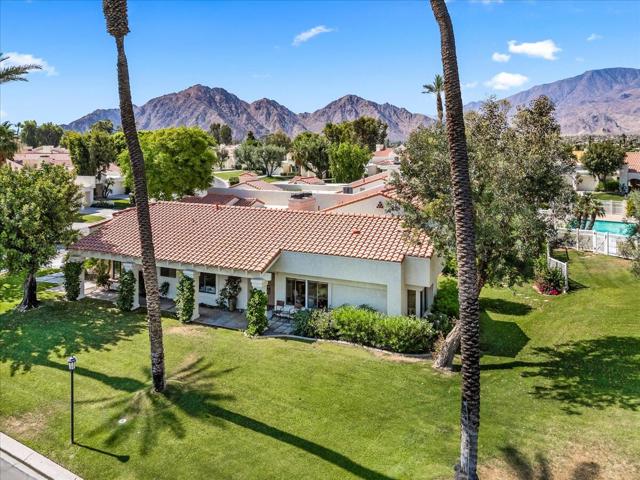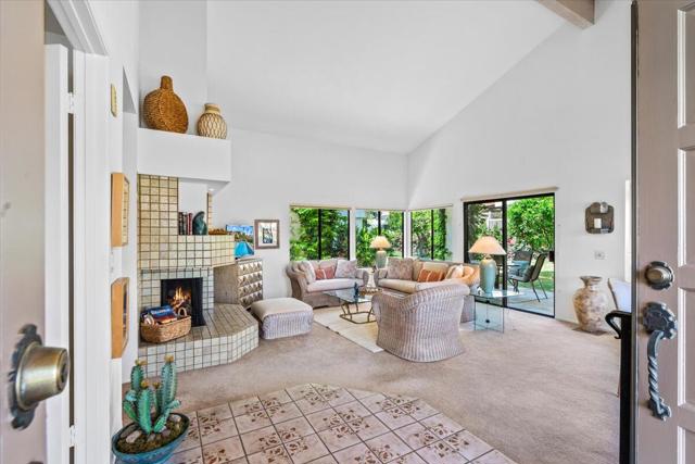 Embrace your dream of the desert! This rare location is a light-filled extravagance of mountain views, seldom found in this three-bedroom Chapala model! Volume ceilings emphasize the spacious living-dining area, which offers ample room for entertaining. A charming fireplace enhances the appeal on those chilly mornings, and a patio opens onto a green space alive with Bougainvillea and fruit trees. The nearby pool and spa beckon you to enjoy a few laps or a relaxing soak after a game of golf, pickleball, or tennis! Encircled by the Santa Rosa Mountains, every room of this beautiful home offers a view! The spacious master suite boasts a romantic fireplace, and opens to a serene private patio. Dual closets and a recently redone bath with a double vanity and an oversize step-in shower complete the luxurious feel. Your guests will enjoy the serenity of the second bedroom adjoining the hall bath, which has also benefited from a recent contemporary remodel. The current sitting room/office space can easily be converted to a third bedroom, perfect for the friends who want to share in your new lifestyle! Santa Rosa cove offers 10 pools and spas, 3 tennis courts, and enviable proximity to the La Quinta Resort and Old Town La Quinta. Two golf courses wind through the community, and the Pete Dye Clubhouse is on site for dining, drinks and events. Your desert dream begins here!