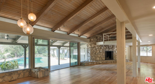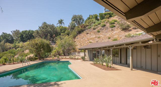 Built the year Elvis Presley bought Graceland this could be your private haven with lots of space, a view over the City of Angels and style all wrapped into one. On the biggest lot at the end of one of the prime streets in the hills while only two minutes from Sunset, the property is private but with a head on view, an extra-large pool, a pickle ball court, mature trees and parking for many. The house opens to a great room open to two stories with a library above, connecting to a kitchen with breakfast area, two bedrooms and bath upstairs and a bar with game room below. Primary Suite with pool access, dressing room and bath, as well as two additional bedrooms complete this jewel. It brims with architectural details like rock walls, built ins, wood floors and more.