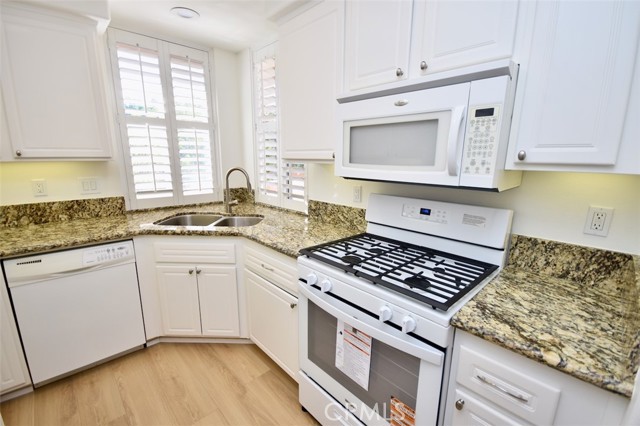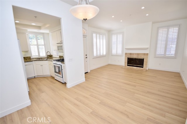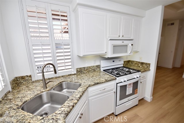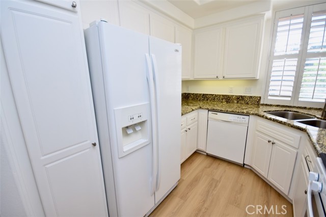 Beautiful 2 bedroom, 1 bath, fully REMODELED upper-level condo offers privacy with no one living below! The home is light and bright with high vaulted ceilings. Newly remodeled with beautiful new engineered wood flooring throughout, new paint, new appliances and new hardware. Recessed lighting, granite counter-tops in the kitchen and bathroom, wood shutters throughout and lots of storage. Deluxe kitchen with Euro-white cabinets, updated appliances including refrigerator. Separate dining area. Closet organizers in both the bedrooms. Convenient inside laundry room has built-in storage with washer and dryer included. Oversized detached one-car garage has 3 big overhead storage for the big items. Great inside location with a large patio. Enjoy access to association's resort-like pool, spa, tennis and walking/biking trails. Walk across to dining, markets, shops, LA fitness and more. Easy access to freeway-5 or 405, John Wayne Airport, train stations, The District and UCI and world class Irvine schools.