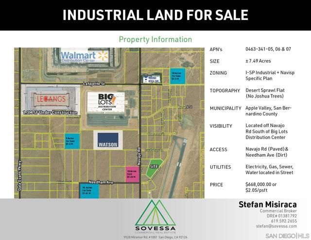 7.49-Acre Industrial Development Opportunity in the North Apple Valley Specific Plan (I-SP) off Navajo Rd. The site (three contiguous parcels) is zoned Industrial Specific Plan (I-SP) and can accommodate a ±147,000 SF industrial building. Water & sewer are in place along Navajo Rd (buyer to verify), delivering significant cost and time savings. Permitted Uses for site include, manufacturing, warehouse/distribution, showroom & office combinations, regional logistics facilities, and support services. Outdoor storage allowed. Centrally positioned among multiple recent institutional-grade land sales and major logistics investor holdings make this site is ideal for a industrial user, investor or developer that can see the future potential. The site is in the path of growth with over 6.7 Million SF of industrial buildings in various stages of entitlement nearby. Close to the future Brightline West “Victor Valley” High-Speed Rail Station – the only stop between Rancho Cucamonga and Las Vegas Across from the Apple Valley Airport, Walmart & Big Lots Distribution Centers. Just off Navajo Rd – a primary north/south arterial with excellent visibility and access to the 15 Fwy. 1.3 million SF industrial project currently under construction immediately north of the site Ability to purchase 2.2 acre corner parcel for a total of 9.69 acres World-Class Logistics Advantages ±109 miles (under 2-hour drive) to the Ports of Los Angeles & Long Beach Immediate access to I-15 and I-40 transcontinental interstates 25 miles to the new $1.5 Billion BNSF Barstow International Gateway (B.I.G.)