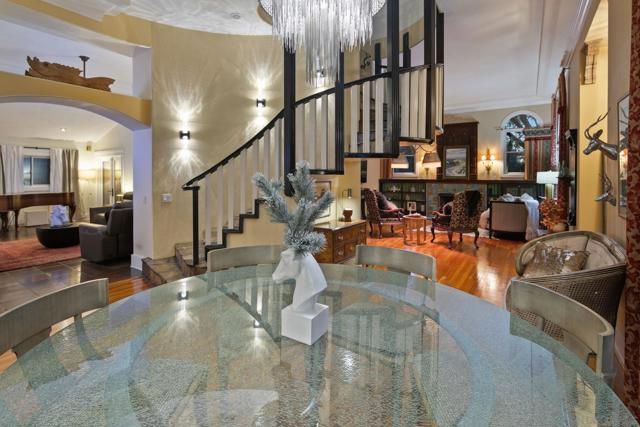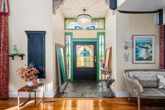 Perched in the coveted Horizon Hills enclave and nestled against the foothills of Mt. Merritt and Mount Helix, this extraordinary 1.3-acre view estate offers a rare blend of privacy, character, and modern luxury. A park-like setting with mature landscaping, fountains, gardens, and sweeping views over the El Cajon Valley sets the tone the moment you arrive. The main residence spans over 3,200 sq. ft. and showcases timeless craftsmanship, including polished hardwood flooring, stained-glass windows, crown-molded palatial ceilings, unique vintage lighting, and multiple fireplaces. The light-filled interior features two inviting living areas, a first-floor ensuite bedroom, and a designer-curated aesthetic that seamlessly complements the home’s 1925 architectural heritage. At the heart of the home is the stunning gourmet kitchen—complete with double Sub-Zero fridge and freezer, farm sink, center island, skylights, new Dacor smart oven/microwave, Kenmore Pro six-burner range, and an adjacent sitting/dining area ideal for intimate gatherings or entertaining. Upstairs, a gracious primary retreat offers two walk-in closets, a dual-sided fireplace, and a spa-inspired marble bath with a jetted soaking tub. Additional guest bedrooms share a spacious Jack-and-Jill bath, and the expansive multi-purpose room provides added flexibility for laundry, crafts, hobbies, or storage. Resort-style living continues outdoors with a beautifully built pool featuring a waterfall, slide, umbrella stations, and expansive Trex decking—perfect for hosting large gatherings or relaxing in total privacy. A wrap-around driveway, basketball court, and extensive parking accommodate vehicles, toys, boats, and RVs with ease. A detached, approximately 700 sq. ft. guest house with a full kitchen offers ideal accommodations for extended family, visitors, or rental income. Other notable highlights include new windows, ample storage throughout, workshop with dedicated 220V for equipment, central vacuum system, newer HVAC, stone and hardwood flooring, multiple patios, ready-to-install spa slab, and the option to convert the detached garage back if desired. Tucked well off the beaten path yet minutes to everyday conveniences, this meticulously cared-for estate embodies the best of Horizon Hills living—where historic charm, designer updates, and exceptional amenities come together to create a one-of-a-kind sanctuary.