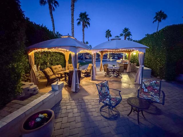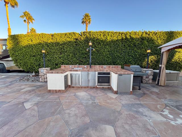 Outdoor Resort Indio is a Class A Motorcoach resort. This is an RV lot. Offering both privacy and stunning golf course views. The resurfaced RV pad easily accommodates a 45-foot coach, and the lot is partially furnished with a small outdoor kitchen for effortless outdoor dining. Two gazebos with fans and lighting provide shaded comfort, perfect for relaxing or entertaining as the sun sets over the lush greens. With resort-maintained landscaping next to the golf course entrance, and picturesque palm trees, you can enjoy a pristine environment.Ideally located close to all resort activities, this lot offers easy access to the main pool, social events, and recreational facilities. Nearby on-street parking makes hosting guests convenient, while the wide street entrance allows for seamless RV maneuvering. Whether enjoying a quiet evening under the gazebos or entertaining friends with scenic views, this lot delivers the perfect combination of luxury, comfort, and resort-style living. For those thinking of creating something new, take in the view and imagine the possibilities.