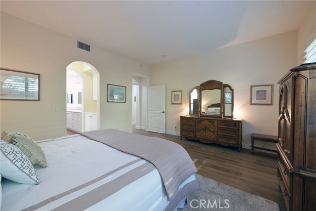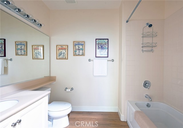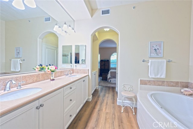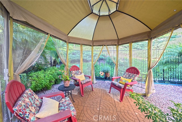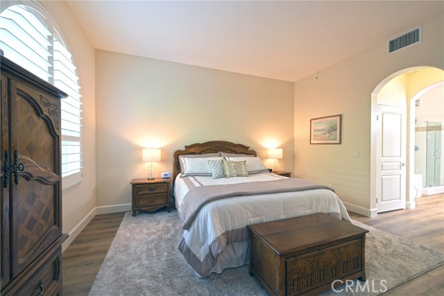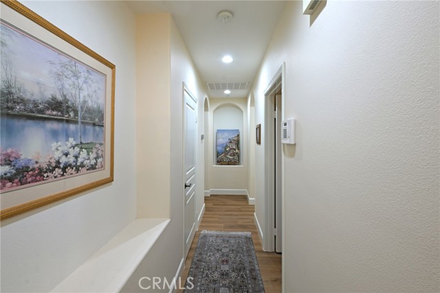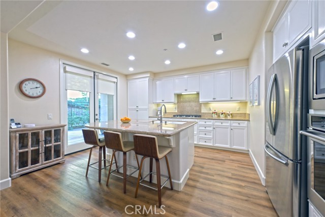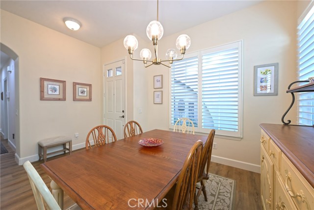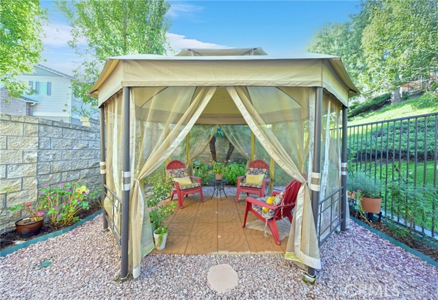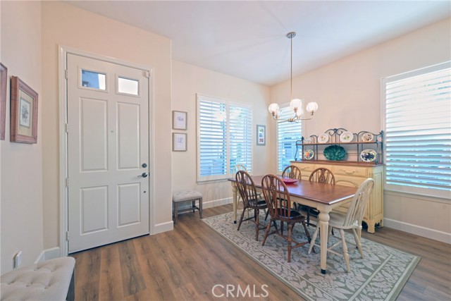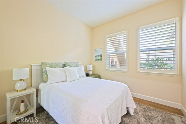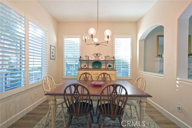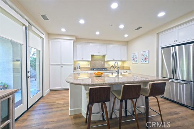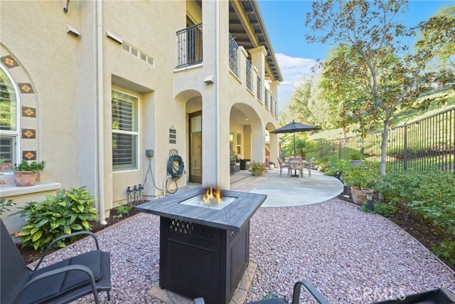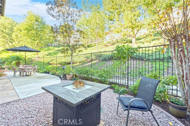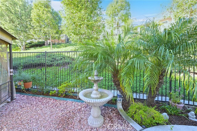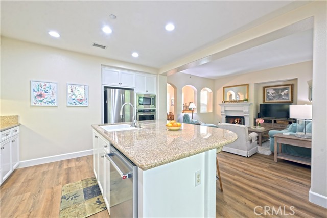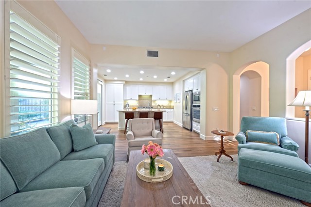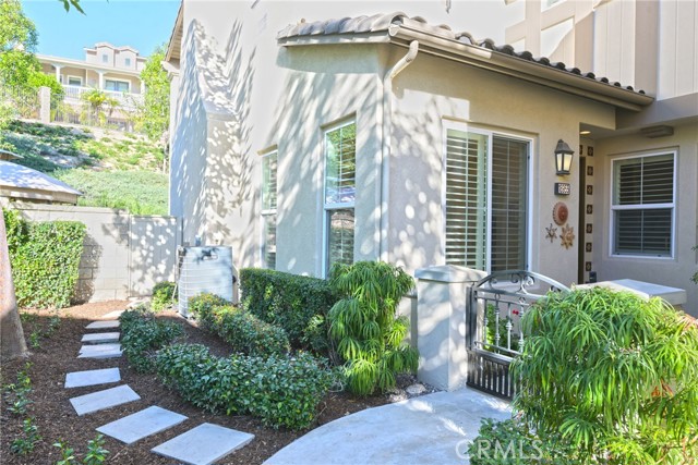 Welcome to luxury living in the prestigious San Lorenzo community of Yorba Linda. This fabulous single-level corner-unit townhome offers 1,702 square feet of beautifully appointed living space, three bedrooms, two-and-a-half bathrooms, and an attached two-car garage. The interior features luxury vinyl plank flooring and plantation shutters throughout, creating a warm and sophisticated atmosphere. The stunning gourmet kitchen features granite countertops, a large island with bar seating, stainless-steel KitchenAid appliances, including a five-burner cooktop, LED recessed lighting, and an abundance of cabinetry. The kitchen opens to an inviting family room enhanced by high ceilings and a charming gas fireplace with logs. The dining room offers high ceilings and a new chandelier. The spacious primary bedroom features an elegant arched window and leads to a luxurious primary bathroom appointed with dual sinks, Corian countertops, a tile backsplash, a large wall-sized mirror with upgraded fixtures, a soaking tub, a frameless glass shower, and a generous walk-in closet with a chandelier. The secondary bedrooms are equally inviting, offering high ceilings and mirrored closet doors. The hall bathroom includes a tub/shower combination with Corian countertops, while the powder room provides a pedestal sink and updated fixtures. Additional conveniences include an inside laundry room with built-in cabinetry and a two-car garage with epoxy flooring and a workbench area. A spacious backyard space with updated landscaping includes a lemon tree and a newer gazebo. Recent upgrades completed in 2020 include the water heater, interior paint, flooring, baseboards, kitchen faucet, garbage disposal, several appliances, and refreshed backyard landscaping—enhancing both comfort and curb appeal. HOA amenities include a swimming pool, spa, and clubhouse. This exceptional property offers upscale living in a serene community close to shopping, dining, and award-winning schools.