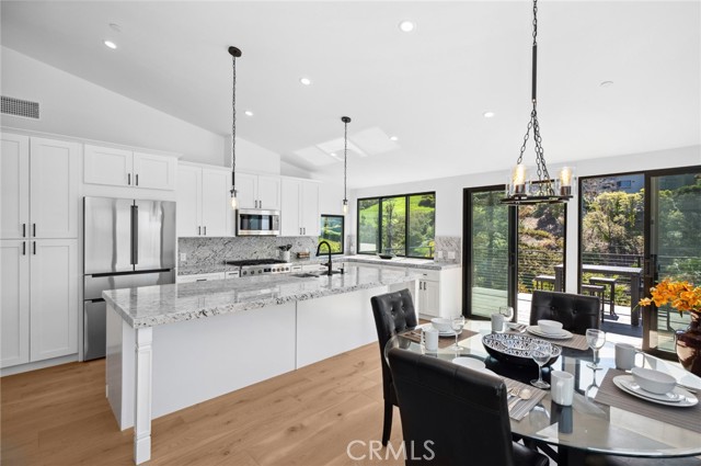 Embraced by a beautiful setting with ocean and canyon views on a cul-de-sac homesite, this spectacular single-level, fully upgraded residence effortlessly blends indoor-outdoor living in a delightful environment that enhances every aspect of your lifestyle. Enjoy relaxed days, special moments, and unforgettable occasions with the ones you love in an open and inviting design that offers three bedrooms and two bathrooms across approximately 1,286 square feet. This open-concept home, upgraded in 2024, provides the perfect backdrop for coastal living, starting with an inviting oversized ocean-view front deck that sets the tone. Inside, a beautifully arranged dining, kitchen, and family area is designed for both elegance and ease. Vaulted ceilings and brand-new Milgard windows frame sweeping views, extending from the fireplace-warmed living room to the coastal-view dining space—an ideal setting for entertaining. The expansive wraparound deck continues the living experience outdoors, where vibrant sunsets and Catalina Island views create a truly magical ambiance. The chef’s kitchen is both functional and refined, featuring stone countertops, custom cabinetry, and a center island with charming breakfast seating. High-end Bosch appliances, including a built-in 6-burner range, complete the space seamlessly. The tranquil primary suite offers a peaceful retreat with a luxurious bath that includes a double vanity, a tub, and a separate shower. Two additional bedrooms and a bathroom, with a walk-in shower, provide comfort and flexibility for guests or family. Bathed in natural light and cooled by gentle ocean breezes, the home also boasts extensive upgrades, including all-new plumbing and electrical systems, a new roof, a new HVAC system, a new tankless water heater, and an electric car charger. Ample parking is available in the driveway, located just beyond the two-car garage. This gorgeous, move-in-ready home is just moments from the upscale boutiques, galleries, cafés, and restaurants of Laguna Beach’s vibrant Village. Pristine beaches, romantic coves, and scenic hiking trails are nearby, enriching a coastal lifestyle that you’ll treasure for generations to come.