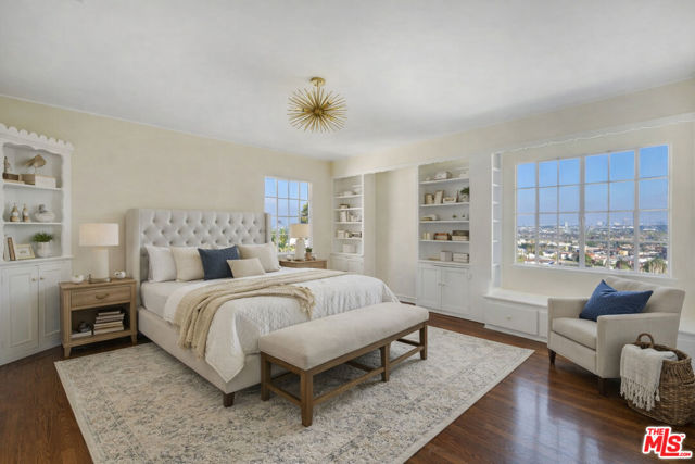 Perched in the highly coveted historic View Park neighborhood, this stately traditional 5-bedroom, 5-bath residence offers breathtaking, expansive city views stretching across Downtown Los Angeles and beyond. Thoughtfully designed with a seamless, flowing floor plan, nearly every room captures stunning skyline vistas creating a dramatic yet serene backdrop for daily living and entertaining. The main level is ideal for hosting, anchored by a chef's kitchen featuring an oversized center island, custom cabinetry, elegant pendant lighting, a side-by-side Sub-Zero refrigerator, warming drawer and a professional-grade Wolf range oven. Adjacent living and dining spaces open effortlessly, framed by custom moldings, French doors, and refined architectural details throughout. The oversized living room impresses with coffered ceiling and timeless craftsmanship, while contemporary decorative lighting adds a modern touch. All five bathrooms have been beautifully updated, and the home is equipped with central heat and air for year-round comfort. The flexible layout includes 3 bedrooms and 2 baths upstairs, a bedroom/study, power room & full bath on the main level, and a lower level with the 5th bedroom, full bath and family room that opens directly to a quaint covered patio and the backyard where expansive city views continue to steal the show. Centrally located 15 minutes from Beverly Hills, the beach cities, Downtown Los Angeles, and LAX...this exceptional home combines classic elegance, modern convenience, and an unparalleled location in one of Los Angeles' most sought-after neighborhoods.