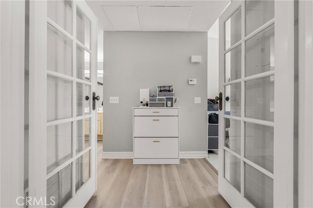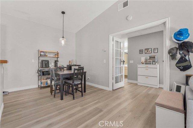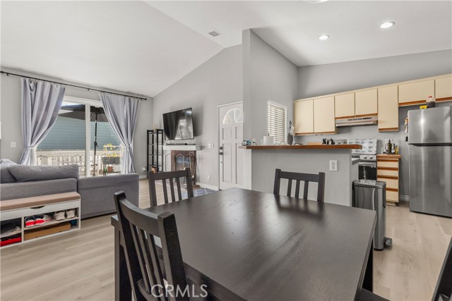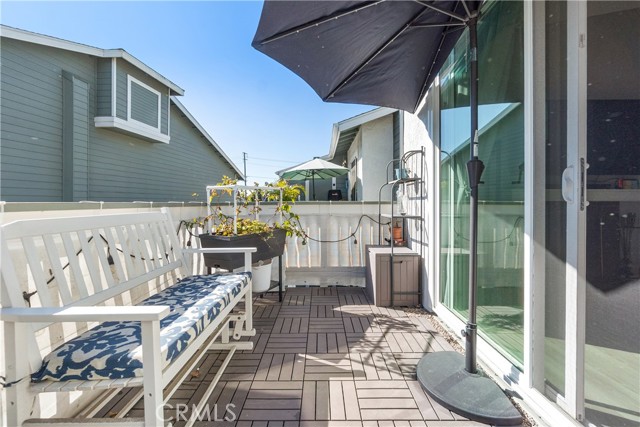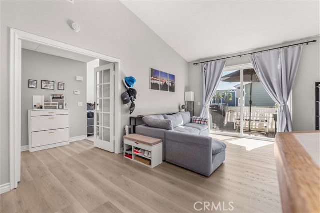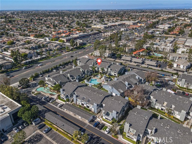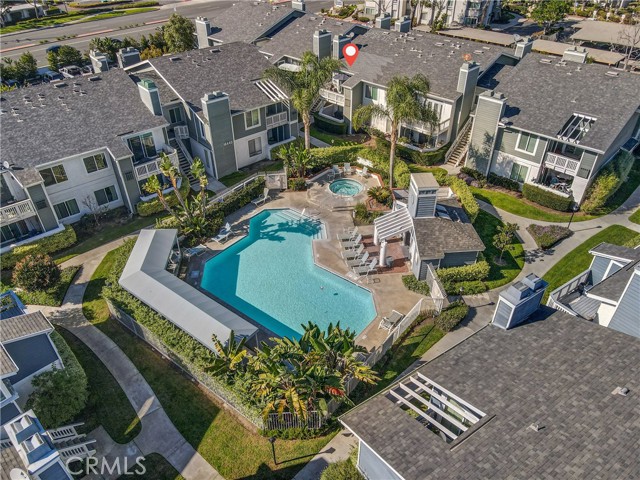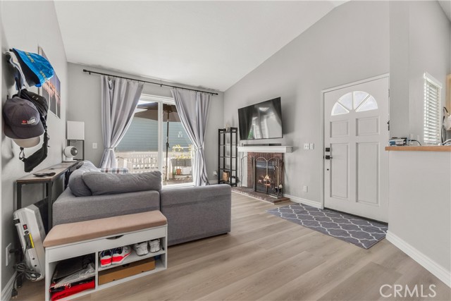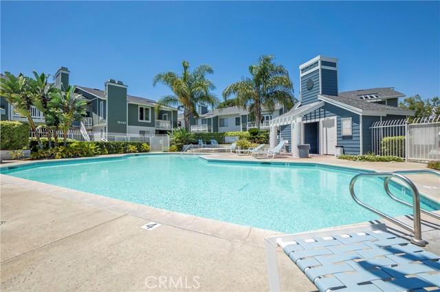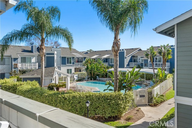 Resort living in Fountain Valley’s New Chase community. This stunningly remodeled upstairs 1BD/1BA condo boasts soaring high ceilings, fresh interior paint, and recessed lighting. Perfectly positioned directly across from the pool and one of the community's two hot tubs, the home features elegant double French doors and an abundance of natural light. Upgrades include new dual-pane windows, new waterproof luxury vinyl plank flooring, and a kitchen reverse osmosis system. The kitchen features new stainless steel appliances including a range, hood, and fridge, plus a breakfast bar. The living room with fireplace opens to a private balcony with new weather tiles and storage. The bathroom has a refinished vanity and updated fixtures. In-unit laundry with a stackable washer and dryer is included. Gated dog-friendly community with no breed restrictions. Residents enjoy access to a sparkling pool and two hot tubs, with the second spa located at the back of the complex for added convenience. HOA includes water, trash, and landscaping; just pay electric and internet. Recent HOA updates include pool and spa repaving, new asphalt roads, and new carport woodwork plus paint. Direct access to Santa Ana River trail and guest parking. Minutes to Mile Square Park and beaches. Stove, dishwasher, fridge, washer, and dryer included.