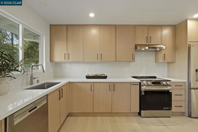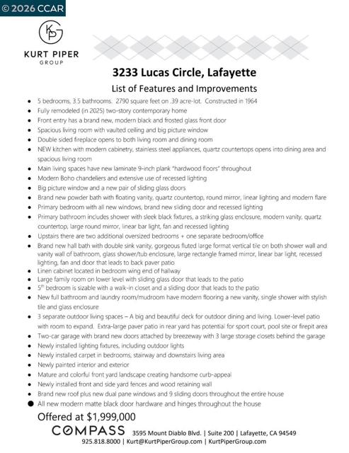 Beautiful “like-new” remodel in the highly sought-after Burton Valley neighborhood, with over $250,000 invested in 2025 to thoughtfully transform this two-story contemporary home. Nestled in the serene Lafayette hills, the residence blends mid-century character with a sleek, modern fit and finish. The light-filled interior offers a flexible floor plan anchored by a stunning double-sided fireplace and a modern open-concept kitchen that flows seamlessly into expansive living and dining areas. Nine brand-new sliding glass doors flood the home with natural light and frame picturesque views of the surrounding landscape from nearly every room. The 2,790± sq. ft. home features 4 bedrooms plus an office and 3.5 fully renovated bathrooms, all designed with premium materials and contemporary styling. The lower level is ideal as a teen retreat, private guest suite, or quiet work-from-home sanctuary.Enjoy exceptional indoor-outdoor living with a large upper deck, lower-level patio, and expansive rear yard with an oversized paver patio—perfect for entertaining or relaxing. Ideally located just minutes from top-rated schools, downtown Lafayette, Walnut Creek, regional parks, trails, Hwy 24, and easy access to Oakland and San Francisco. Available this weekend - no Sunday open.Brokers Tour 2/10.