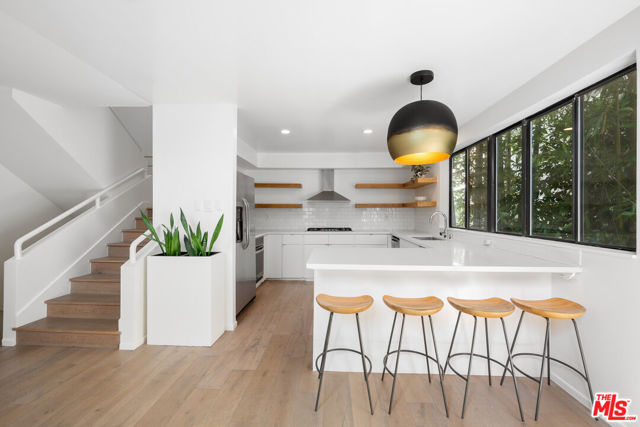 Imagine stepping into a modern sanctuary where expansive spaces and natural light converge effortlessly. This home boasts soaring ceilings that create an immediate sense of openness and airiness, complemented by large, strategically placed windows that flood the interior with sunlight. Beautiful hardwood floors in a light finish add a touch of warmth and elegance to the space, while highlighting a palette of light, neutral colors that amplify the brightness throughout. Welcome to Unit #5, a blend of contemporary elegance and modern design nestled in the heart of Westwood. One of only five meticulously remodeled townhomes in the prestigious William Hefner-designed condo, this residence offers a unique opportunity to experience high-end living in a serene cul-de-sac setting. As you step into the lower entry level, you're greeted by a hallway that takes you to the fully renovated spacious master bedroom with a cozy fireplace, a private balcony, and an expansive walk-in closet. This level also features large bathroom with dual vanities, a separate shower, and a tubperfect for unwinding after a long day. The main level features an airy living room, where soaring ceilings and abundant natural light create an inviting atmosphere. This area, featuring an elegant fireplace, seamlessly extends to a private balcony, ideal for morning coffee or evening relaxation. The newly renovated kitchen is a chef's dream, boasting state-of-the-art stainless-steel appliances and sleek finishes. Ascend to the upper level, and you'll find a stunning secondo bedroom. This space has been transformed with a spectacular 20-foot-long, soundproof sliding window that overlooks the living room, providing a sense of openness and grandeur. The ensuite bathroom and generous closet space offer both convenience and luxury. This versatile room, perfect as a bedroom or home office, also opens to a private enclosed rooftop deck, creating a serene and peaceful retreat. Additional features of this exceptional home include private inside laundry, Nest system and Philips Hue lighting system (all configurable via mobile app), 2-car tandem parking, EV charging and private storage in the garage. Strategically located in Westwood, this building offers easy freeway access and proximity to UCLA, Westwood Village, and all the amenities of the Westside. Essential shopping at Bristol Farms, 99 Ranch Market, and Starbucks is just a short distance away.