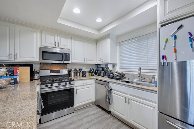 Beautiful, upgraded end unit in Village Walk. Located at the rear corner of the community, you find privacy and quiet serenity. This 3 bedroom 2.5 bath has a great open floor plan. Some features include dual paned windows, scraped ceilings, newer laminate flooring throughout, inside laundry, granite counters and stainless appliances. Situated in great proximity to CSUF, hospital, shopping and easy access to freeways 57, 91 and 5. Not to be missed.