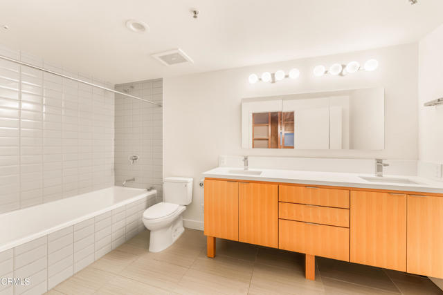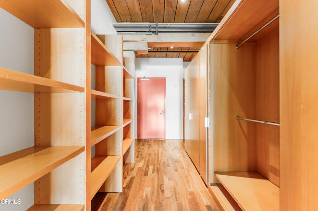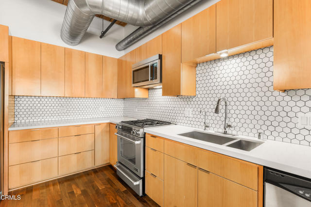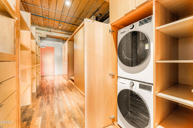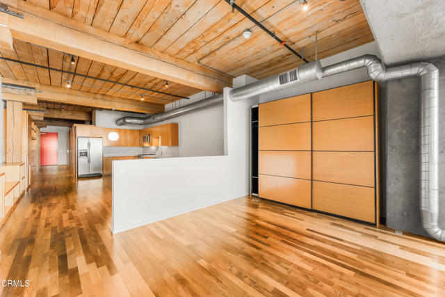 Experience the vibrance of Downtown LA from this beautifully renovated loft in the highly sought-after Arts District, located within the iconic Barker Block. Overlooking the building's lush interior courtyard, this sun-filled residence seamlessly blends architectural character with thoughtful modern upgrades designed to maximize both style and functionality. The open-concept layout is enhanced by custom renovations, including a room divider with integrated shelving and storage, a built-in TV console, and additional hallway storage, creating clearly defined living areas while maintaining the openness of true loft living. A pony wall at the sleeping area, paired with a fully enclosed closet, provides privacy and practicality. The updated kitchen features newer cabinetry and a stylish backsplash, complemented by stainless steel appliances and wood floors throughout the space. The bathroom has been reconfigured, with the washer and dryer closet relocated out of the bathroom, allowing for a more spacious layout and the addition of a double-sink vanity--a meaningful upgrade for everyday comfort. Residents enjoy a gated, covered parking space, 24/7 on-site security, and access to a resort-style rooftop complete with a heated pool and spa, fitness center, BBQ grills, fire pits, and expansive areas for relaxing or entertaining. Just steps from some of LA's best dining, coffee shops, galleries, museums, and the Arts District Park, with easy access to major freeways, Metro lines, and train stations, this home offers the perfect balance of urban energy, comfort, and convenience.