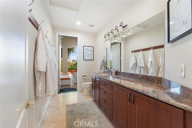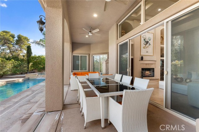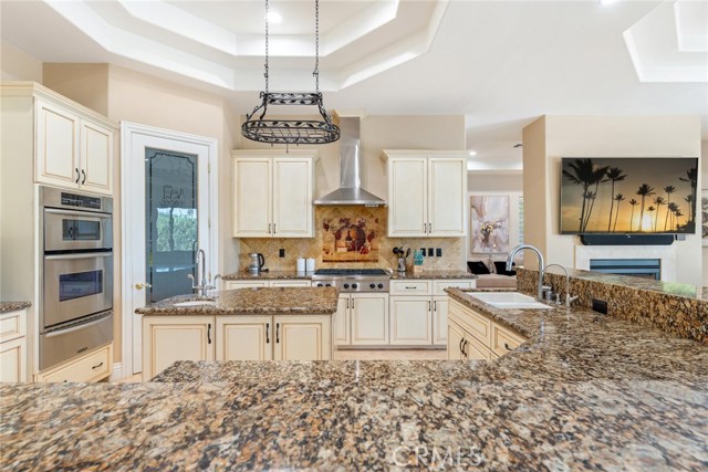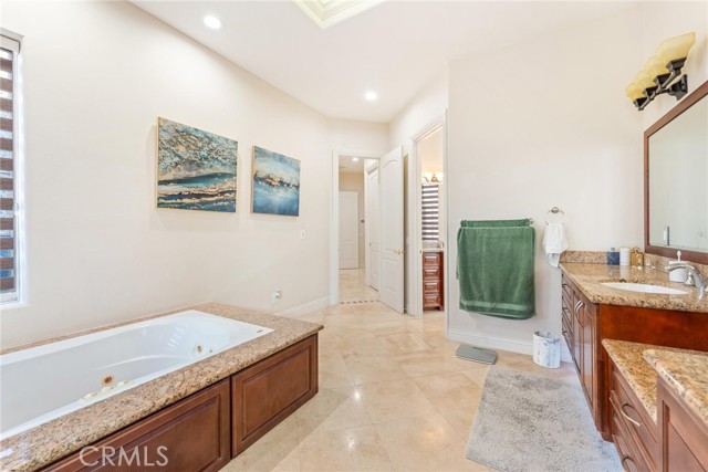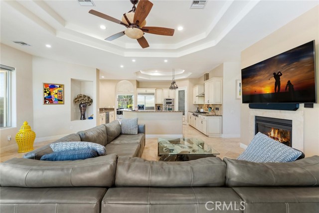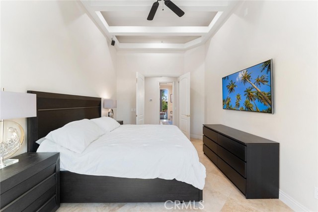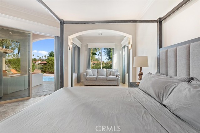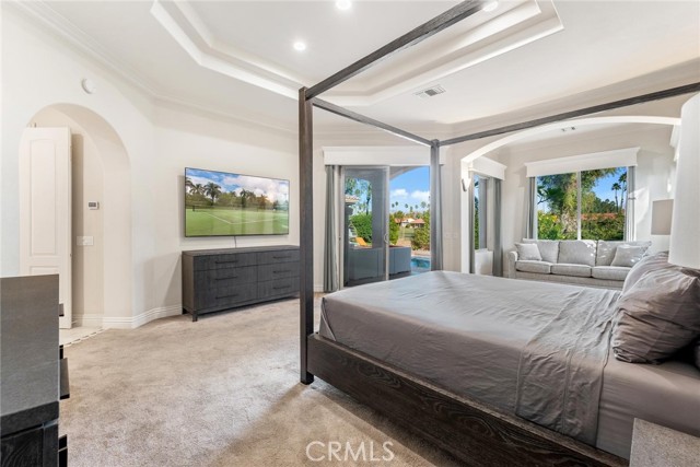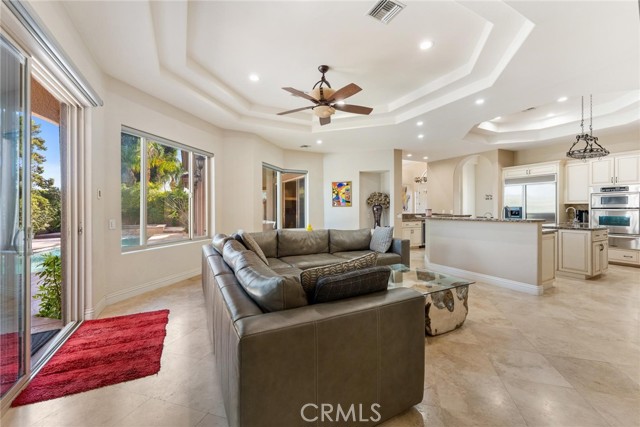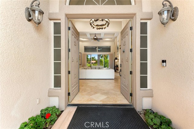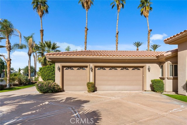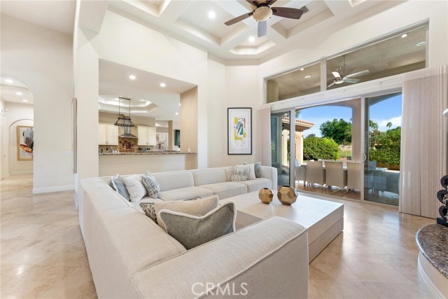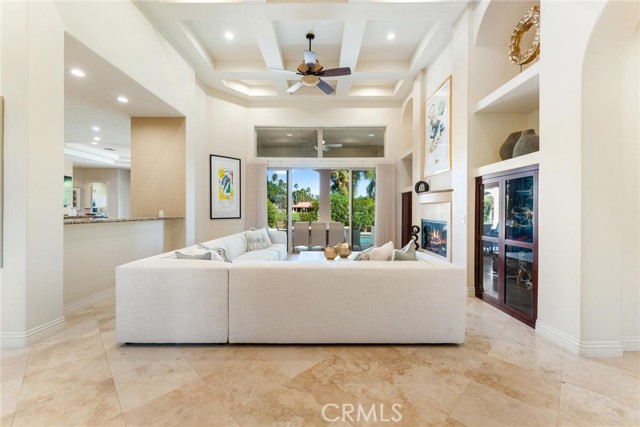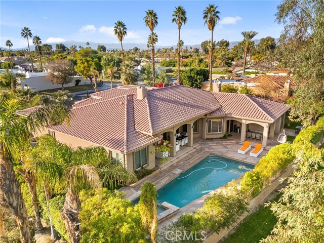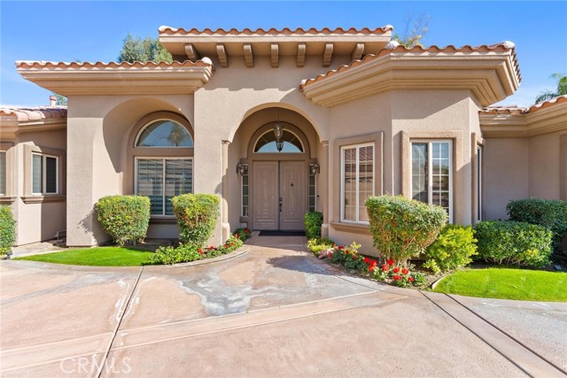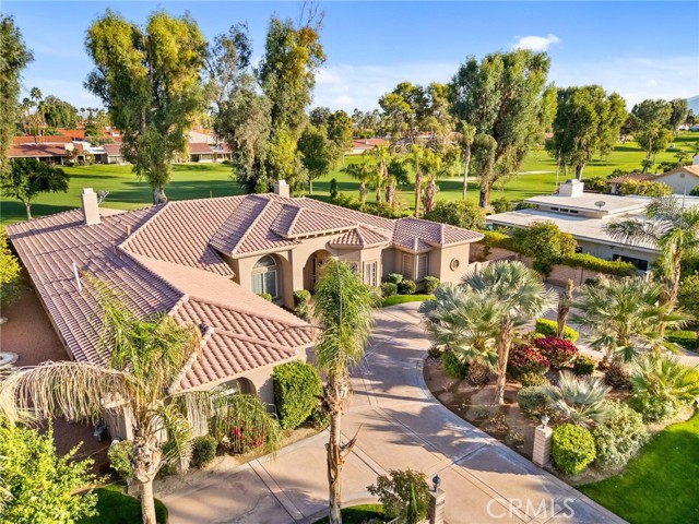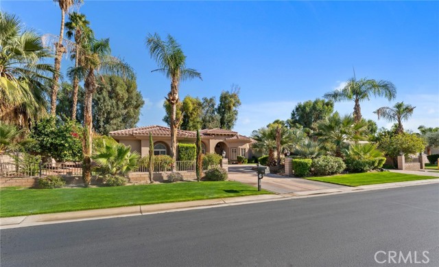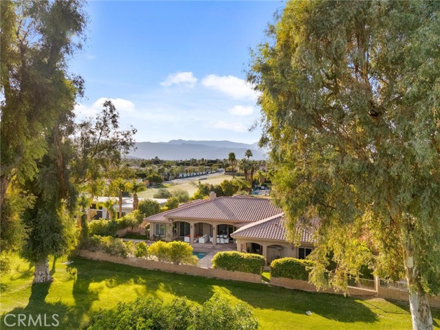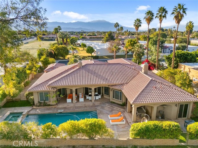 Set along the 13th fairway of Bermuda Dunes Country Club, this custom-built residence offers an exceptional blend of space, privacy, and timeless design. Built in 2006 and thoughtfully finished throughout, the home showcases quality craftsmanship with extensive travertine flooring, granite surfaces, and refined architectural details. The primary suite is a private retreat, featuring a separate sitting or fitness area with serene views of the pool and golf course. The en-suite bath includes a jetted soaking tub, oversized walk-in shower with Kohler body jets, and two spacious walk-in closets. Three additional bedrooms are complemented by a media room, great room, family room, and game room—providing remarkable flexibility for living, working, and entertaining. At the center of the home is a well-appointed kitchen that opens seamlessly to the surrounding living spaces. It features stainless steel appliances, slab granite countertops, and an oversized walk-in pantry, making it both functional and inviting. Beamed and coffered ceilings, along with expansive walls of glass, create a bright, open atmosphere and a strong connection to the outdoors. Situated on an approximately one-third–acre lot, the backyard is designed for relaxation and enjoyment, anchored by a saline Pebble Tech pool and spa with ample room for outdoor living. The HOA fee of $214 per month includes cable television with premium channels (Showtime and HBO), internet service, and 24-hour gated security—offering outstanding value for a home of this caliber. This is a rare opportunity to own a spacious, custom home on the golf course in one of Bermuda Dunes’ most established communities.