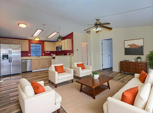 Nestled in the quiet community of Crest at Crest Skylodge South. This home offers beautiful views of rolling hills and sunsets. In this private gated community, you'll enjoy this ready to move in, 3 bedroom, 2 bath home with 1,074 sqft of living space. New Laminate flooring through out, new stainless steel appliances. Affordable space rent at $975.00. Schedule a showing today! Some photos are virtually staged.