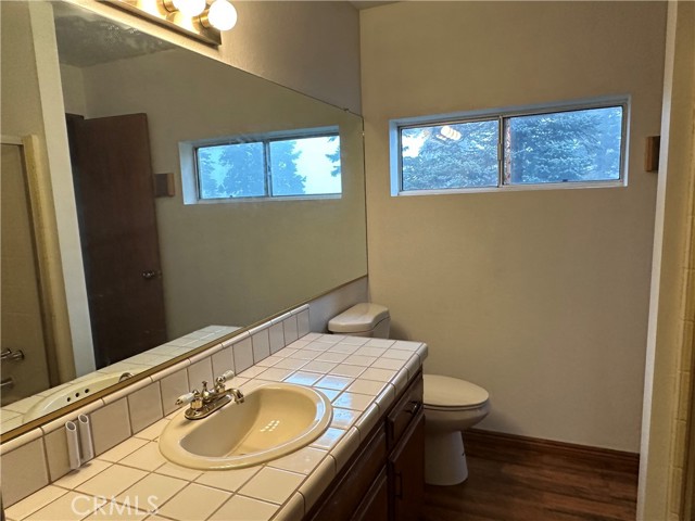 The property has great off street parking, with only a few steps to the front door. When you enter the property, there is a dining area to the left and kitchen to right. Kitchen has great counter space and dishwasher, stove and Refrigerator. There is a half bath on this level and a separate laundry area. There is a large living room with wood burning firplace and lage slider to enjoy the outside deck, there is also a peak of Lake Arrowhead. Upstairs there are two large bedrooms and a full bath. This is a great commuter location.