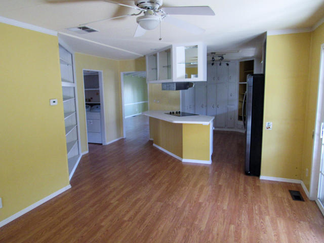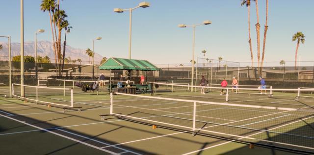 6.098 Sq. ft. lot featuring a sparkling Swimming pool and spa with Mountain Views. The primary bedroom has a slider leading out to the pool and spa. The suite in the rear of the home, has a walk-in closet and a large bathroom with double sinks. The family room is open to both bedrooms and the kitchen for a spacious TV area or office area. The living room/dining room area enjoys a wall of windows for an enjoyable sitting area for dining and entertaining. Laminate flooring and dual pane windows add to the desirability of this unique home in Palm Desert Greens. Relax in style in this resort style home!