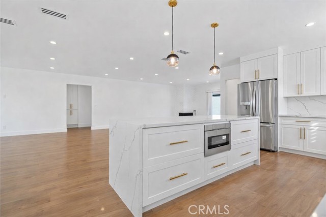 Completely reimagined and renovated from top to bottom, this stunning residence offers the look and feel of a brand new home with thoughtful design and high end finishes throughout. Filled with natural light, the open concept layout creates seamless flow between the living, dining, and kitchen spaces, ideal for both everyday living and entertaining. The chef’s kitchen serves as the centerpiece of the home, featuring custom white shaker cabinetry, quartz countertops with a striking waterfall edge, premium stainless steel appliances, and an oversized island with a built in microwave and abundant storage. Contemporary pendant lighting and recessed lighting throughout enhance the home’s clean, modern aesthetic. Wide plank wood flooring extends across the main living areas, complementing the bright palette and refined finishes. The bathrooms have been fully remodeled with designer tile, modern fixtures, and spa inspired details. Each bedroom is generously sized, offering comfort, privacy, and flexibility for a variety of lifestyles. Major upgrades include updated electrical and plumbing, new windows and doors, modern lighting, and carefully selected materials throughout, delivering a truly turn key property. With every detail thoughtfully addressed, this home presents a rare opportunity to own a fully renovated residence that blends style, comfort, and functionality with a fresh, contemporary feel.