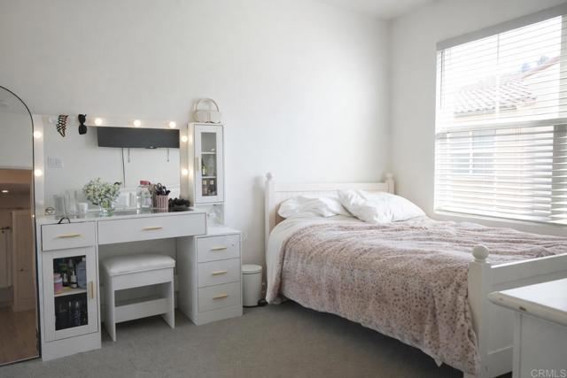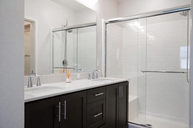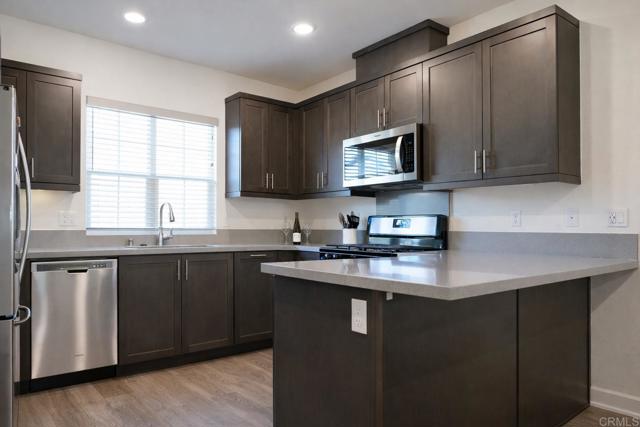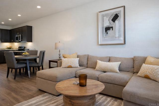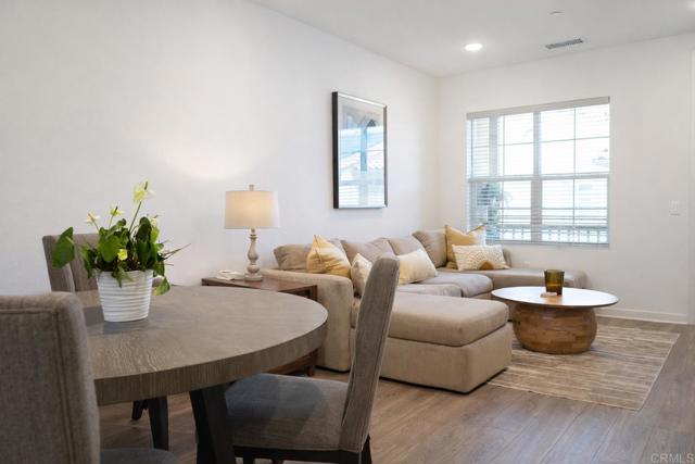 Experience modern living at Skyhaus in Rancho Tesoro, a gated community set against the rolling hills of San Marcos. This well-maintained 2-bedroom, 2-bathroom townhome offers a smart, open-concept layout paired with thoughtful upgrades designed for comfort, efficiency, and everyday ease—including OWNED SOLAR. The home welcomes you through a private, gated patio into a flexible ground-level space that easily adapts to your needs—whether as a dedicated workspace, fitness area, or bonus room. Upstairs, the primary living level feels open and airy, thoughtfully designed to support both daily living and entertaining. The layout places the bedrooms on opposite sides of the home, offering added privacy. The chef-inspired kitchen anchors the space with quartz countertops, sleek stainless steel appliances, and a peninsula with casual seating, creating a natural gathering point while remaining connected to the dining and living areas. Natural light fills the living space, which opens to a balcony—an ideal spot to unwind or host guests while taking in hillside and neighborhood views. The primary bedroom offers a comfortable retreat with plush carpeting, a walk-in closet, and an en suite bathroom featuring dual vanities and a spacious walk-in shower. A second bedroom and full bathroom provide flexibility for guests, family, or additional workspace. Additional highlights include luxury vinyl plank flooring, integrated smart-home features, and an attached two-car garage with EV charging capability and remote access. Enjoy easy access to nearby trails, parks, shopping, dining, and major commuter routes. This property is a true gem!