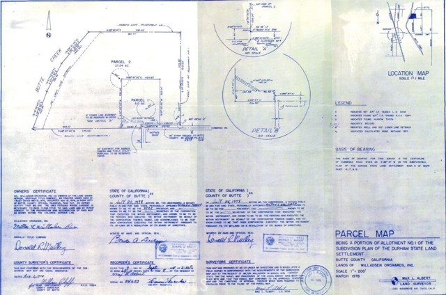 Awesome ±27 acre Durham country property with mature almond orchard and ±1/4 mile frontage along Butte Creek. Durham School District. ±24.25 net acres of mixed age almonds (66.7% Nonpareil, 16.7% Peerless & 16.7% Carmel) with ±1,500-1,800 lbs./acre recent yield history. Younger trees are all on Krymsk 86 rootstock. Irrigation water supplied by an on-site ag. well with 50 HP electrical turbine motor, applying water via R10 solid-set sprinklers in a single set for frost control. Surface water from the Durham Mutual Water Company (Butte Creek diversion) available. Soils are all optimal Almendra & Conejo loam series (Class 1). Close to Durham yet in quiet setting in the country, along Butte Creek. Less than a mile from the Durham Community Park, ±1.00 mile to Durham and just under 4 miles to Chico. Awesome property that would make a great homesite. Property includes direct road frontage along Cummings Lane as well as a ±60' easement to the western portion of the property from the intersection of Cummings Lane and Cummings Road. Butte Co. APNs: 040-650-003 (23.88 acres - orchard) & 040-650-002 (3.36 acres - levee & creek)