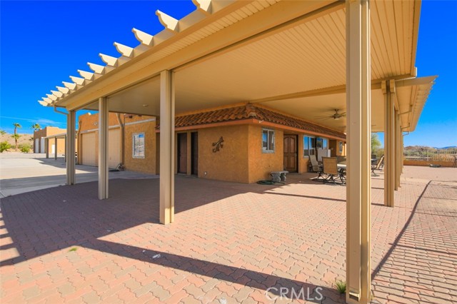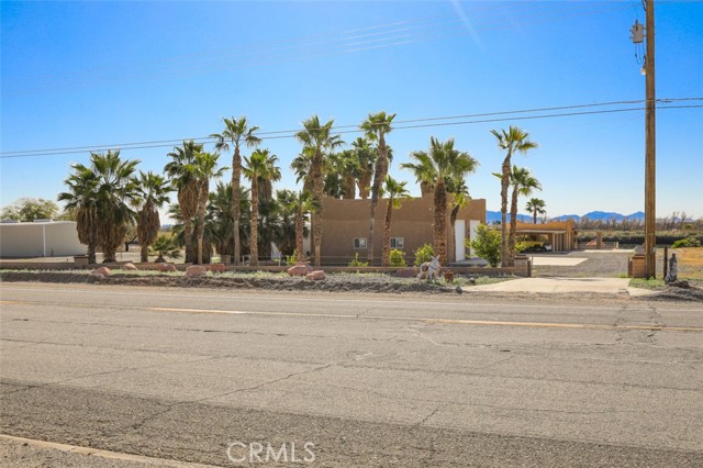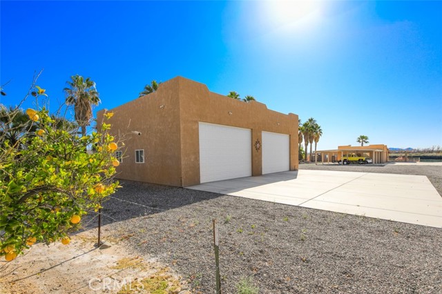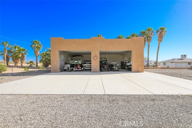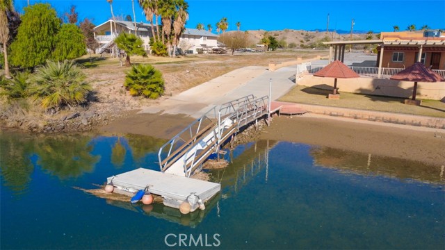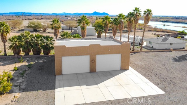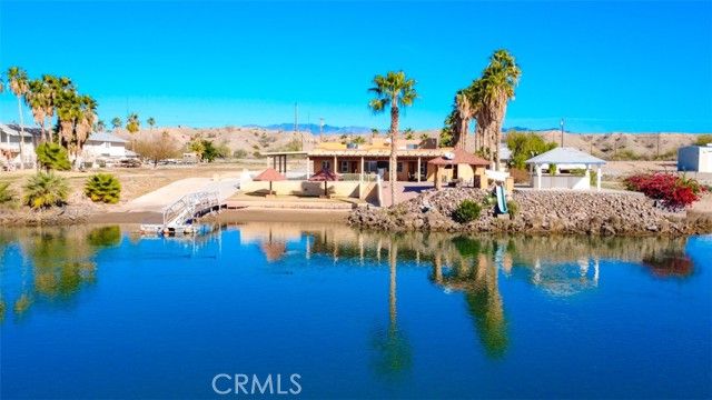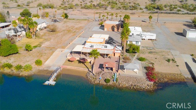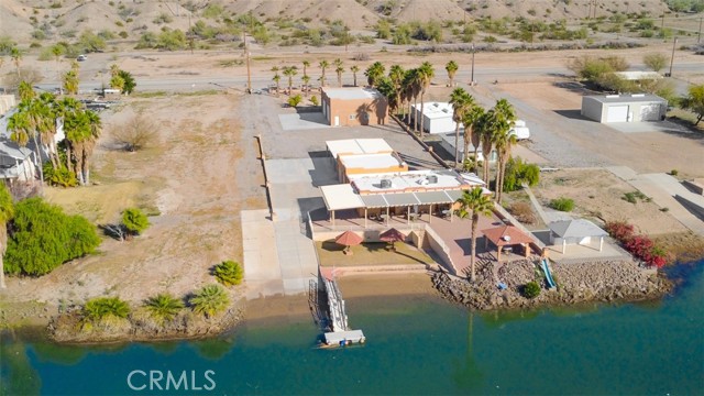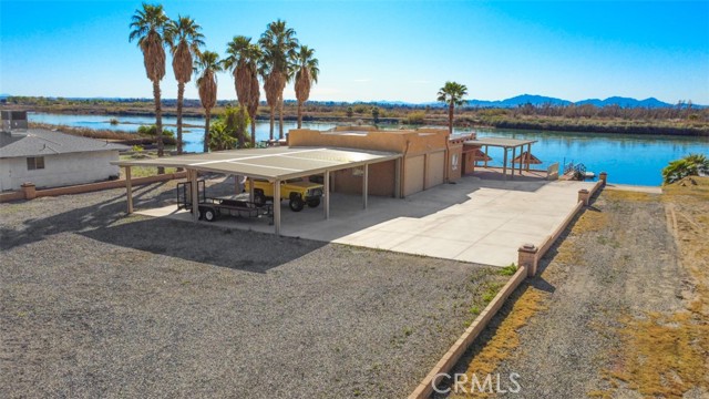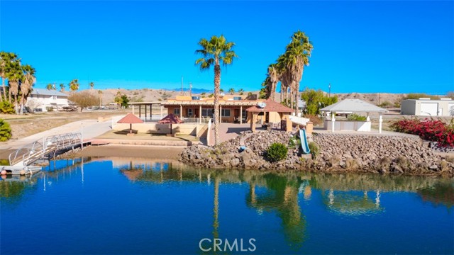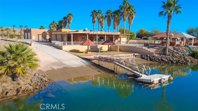 MAJESTIC – One-of-a-Kind Riverfront Property! Located just six miles west of Parker on the California side of the Colorado River, this Spanish-style custom home was designed to embrace and share the ultimate river lifestyle. Thoughtfully set up like a duplex, one side offers 2 bedrooms, a bathroom, living/dining area, full kitchen, covered side patio, and storage shed. The other side features an oversized bunk-style bedroom designed to accommodate multiple beds, plus its own bathroom, living/dining area, and kitchen—perfect for hosting family and friends. The property also includes a massive stucco garage, plenty of room for 8 cars, boats and all your toys, complete with an additional room and bathroom inside, 5th-wheel hookups with patio, and approximately one acre enclosed by brick-lined walls accented with Sedona desert rock, palm trees, and fruit trees, with ample room to build, expand, or plant more. The riverfront is truly exceptional—stylish paved brick shoreline, stone fire pit, gazebo at the water’s edge, built-in bar and table, water slide, diving board, private beach area with retaining wall and sand, two palapas with tiled tables, outdoor shower, private boat ramp, dock, and designated swim area when water levels allow. Ideal as a retirement retreat, vacation getaway, or multi-family river compound.