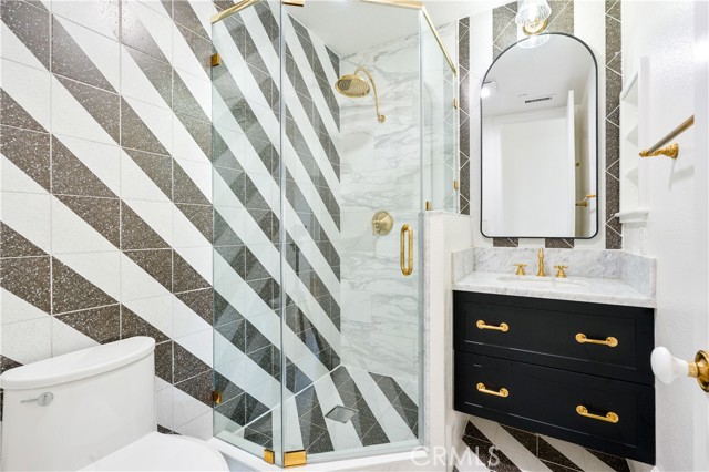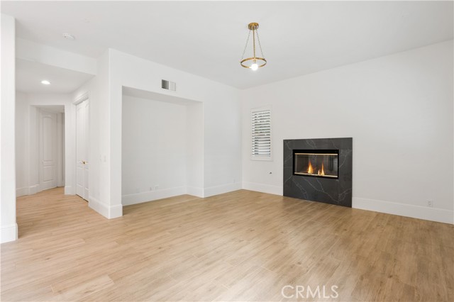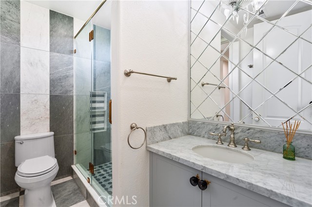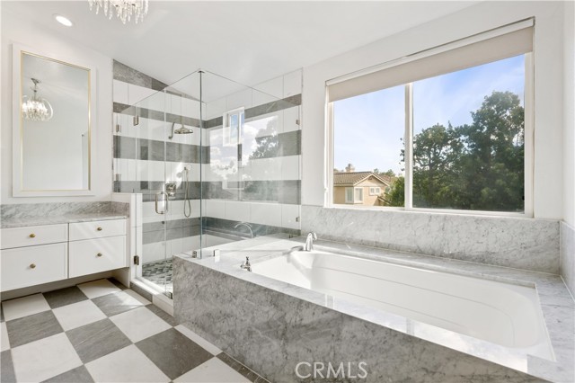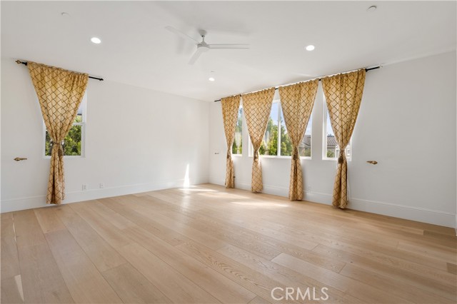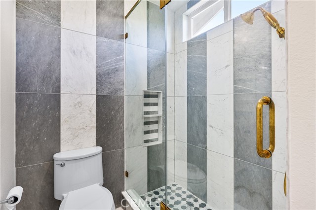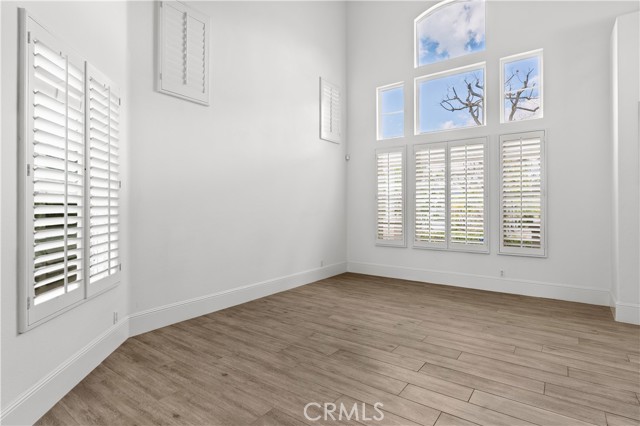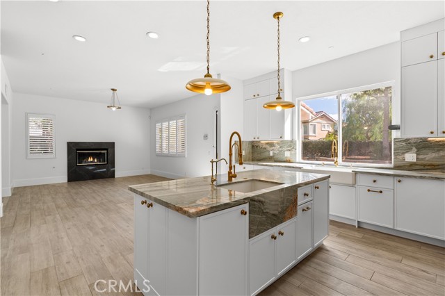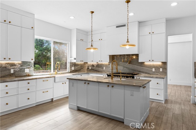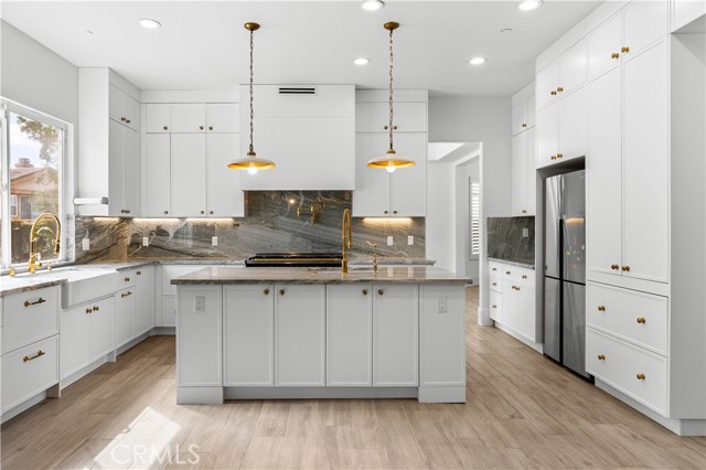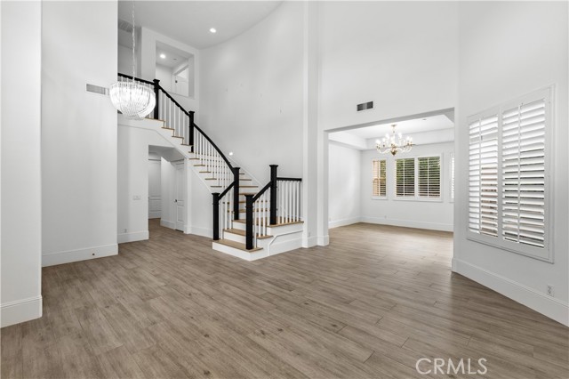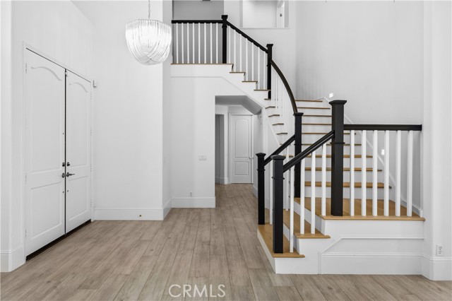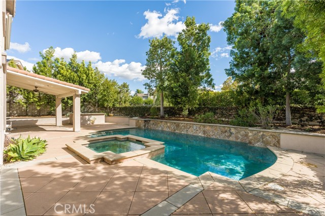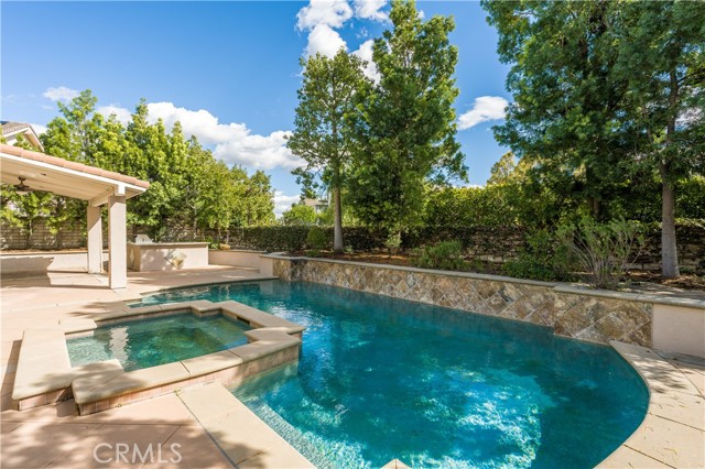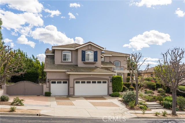 Located in the gated Emerald Ridge community at Live Oak in north La Verne, this fully remodeled residence presents refined curb appeal with manicured landscaping, mature trees, and a concrete driveway accented by paver inlay. An extended drive leads to gated RV parking. The front patio features a concrete sitting area beneath a covered pergola, while a covered porch frames double front entry doors. Inside, wood-patterned tile flooring extends throughout the main level beneath soaring ceilings. The formal living room is filled with natural light from multiple front-facing windows fitted with plantation shutters. Adjacent, the formal dining room showcases a trey ceiling, chandelier, shuttered backyard-facing windows, and direct access to the kitchen. The remodeled kitchen is appointed with classic white cabinetry, granite countertops, and a full granite backsplash. A 48-inch built-in ILVE eight-burner gas range with double ovens anchors the space, complemented by a pot filler, farmhouse sink, prep sink within the center island, pendant lighting, and a walk-in pantry. The layout opens seamlessly to the family room. A breakfast nook connects to the spacious family room, highlighted by a custom fireplace and direct backyard access. The main floor includes a generously sized bedroom with an ensuite bathroom, a guest powder room, and a laundry room equipped with a sink, storage cabinetry, and countertop workspace. Upstairs, double doors lead to the primary suite featuring laminate wood flooring, recessed lighting, view windows, and an expansive ensuite bathroom. The primary bath offers dual sinks, a dedicated vanity counter, a walk-in shower with custom tile and frameless glass enclosure, a separate soaking tub with stone surround, and a walk-in closet with custom organizers. Three additional upstairs bedrooms each include remodeled ensuite bathrooms and walk-in closets. The backyard is designed for outdoor enjoyment, featuring a pool with stone backsplash, an elevated spa with spillway, concrete decking, a built-in barbecue with granite countertops and bar seating, a covered patio, and perimeter planters lined with mature privacy hedging. Additional features include owned solar, contributing to reduced electricity costs.