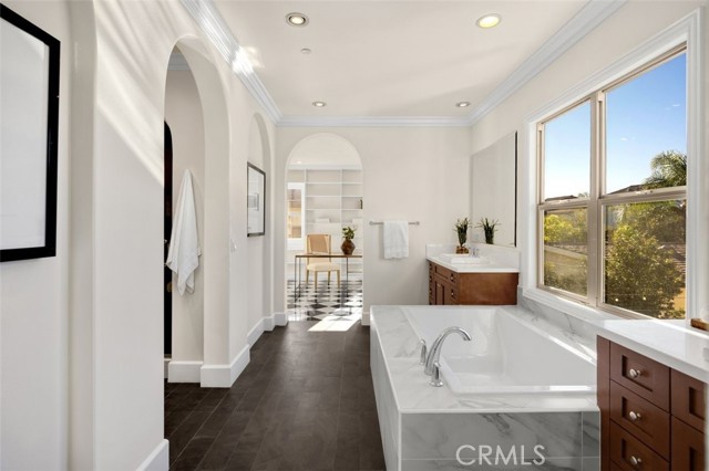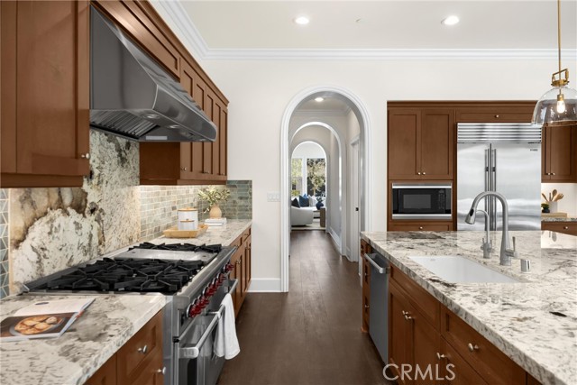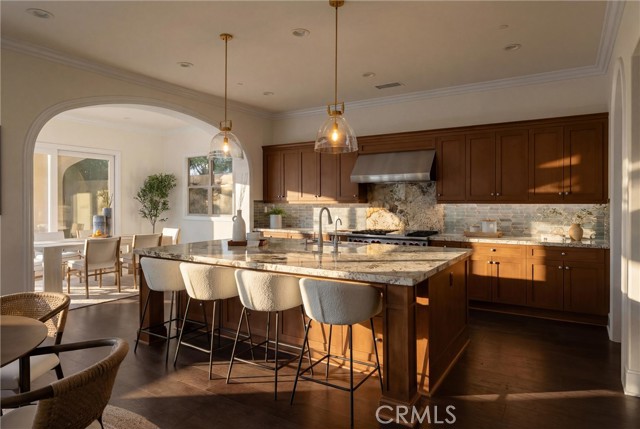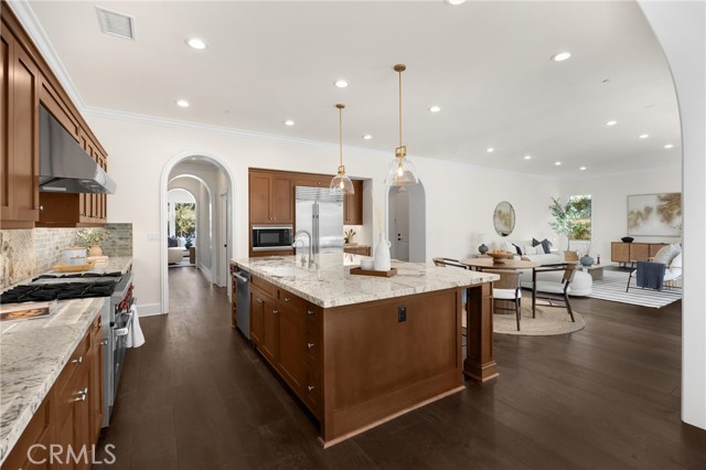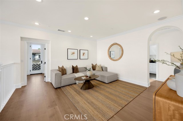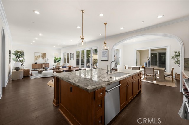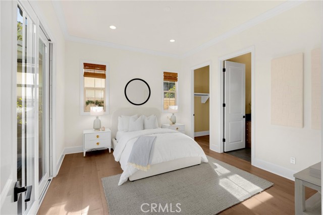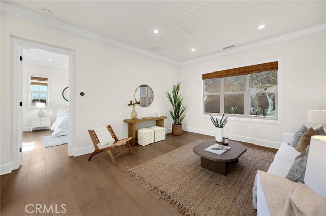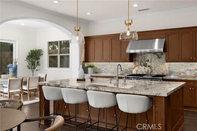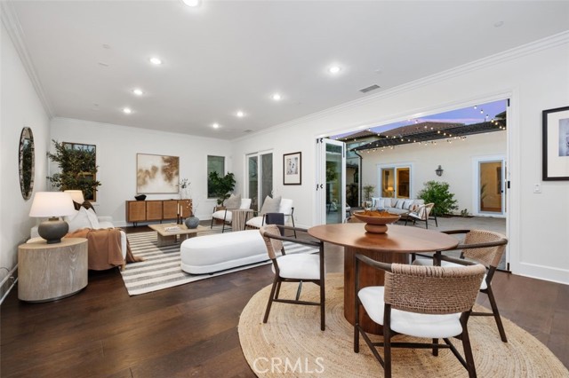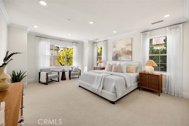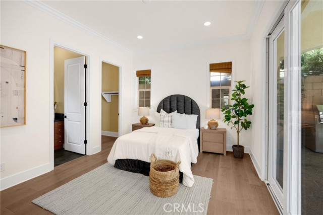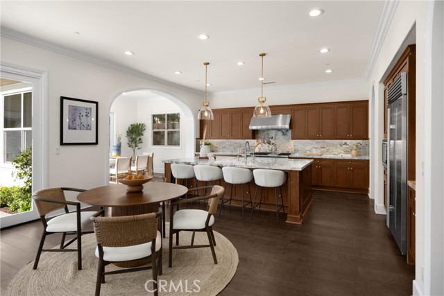 TWO HOMES on ONE lot! The fully detached SINGLE LEVEL guest house with TWO en-suite bedrooms connected by a central family room, offers exceptional privacy and versatility. No Mello Roos Tax! Exclusive 24h guard gated community. 77 Clifford is a luxurious award winning estate The Grove Plan 2. Designed with intentional spaces for grandparents, parents, and children alike. Private retreats and generous gathering areas create harmony for every generation where family legacy and modern comfort coexist beautifully. Embracing a Japandi aesthetic of organic natural materials earthy wood and stone, the design balances simplicity, minimalism, and functionality; creating a calming, harmonious feel. Natural light flows through numerous windows, creating a bright, airy atmosphere throughout. The high-ceiling stairway leads to a versatile loft space. The bedrooms are all en-suite, are uniquely spacious, and designed with privacy in mind. The luxurious primary suite features an enlarged dream walk-in closet with checkered flooring, that attaches directly to the private office. A freshly renovated spa-inspired bathroom, dual vanities, and an additional walk-in closet completes the space. The great room flows seamlessly into a host's dream kitchen, outfitted with PRO Sub-Zero and Wolf built-in appliances. The versatile butler’s pantry is perfect as a coffee station, secondary prep area, or discreet serving space when entertaining. This extension of the kitchen enhances both functionality and flow for elevated everyday living. The main home and guest house are lined with vast windows and towering bi-fold glass doors that open to a spacious courtyard complete with twinkling string lights. The courtyard offers a serene setting perfect for quiet mornings or al fresco dinners.