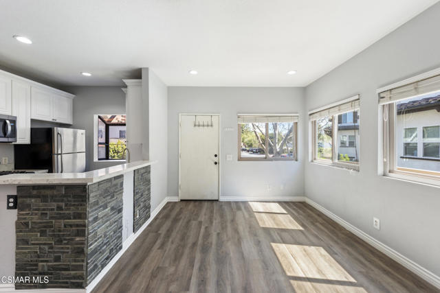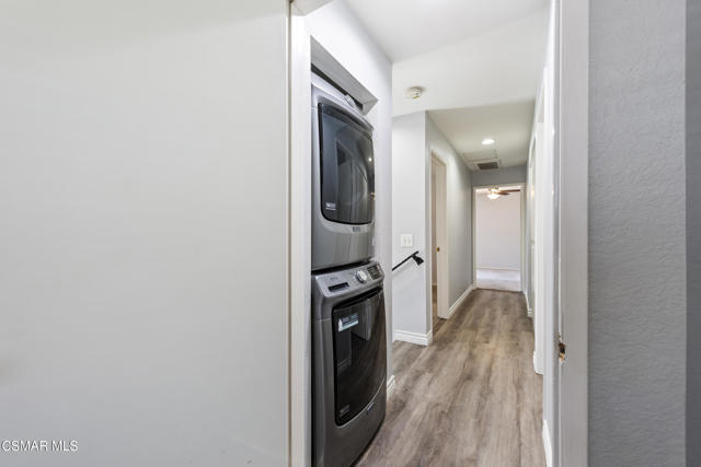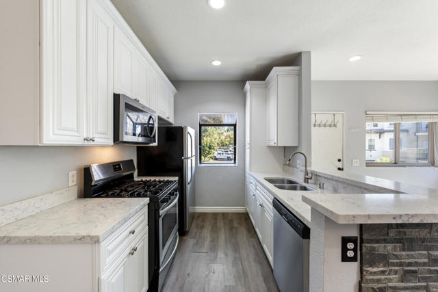Welcome to this beautifully updated 3-bedroom, 2.5-bathroom condominium offering 1,200 square feet of comfortable living space. This two-story home combines modern updates with a practical layout, perfect for everyday living. Step inside to find wood flooring throughout the main living areas and plush carpeting in the bedrooms. The updated kitchen features stainless steel appliances, a gas range, microwave, and crisp white cabinetry, all centered around a convenient island, perfect for cooking and entertaining. The main floor also includes a convenient powder room and a large closet for additional storage. Upstairs, you'll find all three bedrooms, two full bathrooms, and the convenience of in-unit laundry. Enjoy outdoor living on the private wrap-around porch, an ideal spot for relaxing or enjoying the Southern California weather. The community also offers residents access to a pool and spa for added comfort and recreation. Located near major freeway access and within close proximity to numerous dining and shopping options this Thousand Oaks, home offers both convenience and lifestyle.