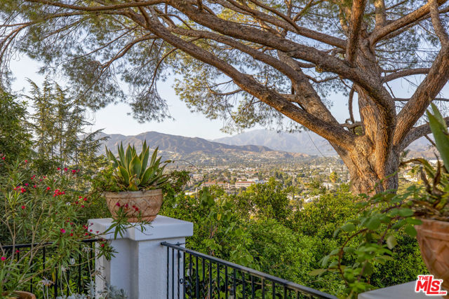 Nestled in Adams Hill, this 1920s Spanish estate seamlessly blends timeless charm with modern updates. Situated on a street-to-street lot, the property boasts sprawling views of downtown Glendale and the San Gabriel Mountains, framed by Mediterranean-inspired landscaping. A light-filled living room and adjacent dining room flow into a chef's kitchen outfitted with marble countertops, ample storage, and a cozy breakfast nook. The main level also features a den, two bedrooms, two bathrooms, and a laundry room. Upstairs, the primary suite serves as a private retreat with panoramic views, a spa-like bath, and a walk-in closet. The lower level provides an additional living area, kitchenette, and bathroom, perfect for guests or a home office. Ideal for entertaining, the designer-done yard, showcased on Architectural Digest's "Replace This Space," is complete with a deck, mezzanine, fire pit, and verdant landscaping. Conveniently located in one of Northeast LA's most sought-after neighborhoods, this exceptional property offers tranquil privacy, access to top-rated schools, and proximity to nearby restaurants like Little Ripper, Dunsmoor, and Bub and Grandma's.