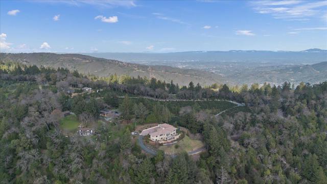 An extraordinary architectural estate set on 86 +/- acres in the Santa Cruz Mountains, just minutes from downtown Los Gatos. Designed to capture sweeping panoramic views of Monterey Bay, the home features soaring ceilings, expansive walls of glass, and refined sight-lines that seamlessly integrate the indoors with the surrounding landscape. Rich hardwood floors and curated finishes define the interiors, offering five spacious bedrooms, three full baths, and two half baths. The primary suite is a private retreat with a fireplace, spa-caliber bath, and a generous walk-in closet. Built with exceptional craftsmanship and uncompromising attention to detail, this meticulously maintained home reflects enduring quality throughout. The grounds offer sculpted landscapes, rose gardens, open meadows, and private trails, complete with recreational amenities, creating a rare balance of luxury, scale, and mountain serenity. Served by award-winning Los Gatos Schools.