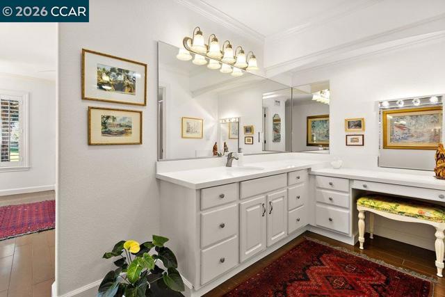 Located in desirable lagoon entry E1 this lower level Sierra condo is exquisitely updated,remodeled.Well maintained,sunny&bright, well lighted,decorative ceiling treatments,classic wood flooring,designer textured walls,remote controled electric fireplace,plantation shutters, tiled back patio facing fairway.Detached single car garage and carport. Walk to Event Center, Creekside, Golf, Pickleball.