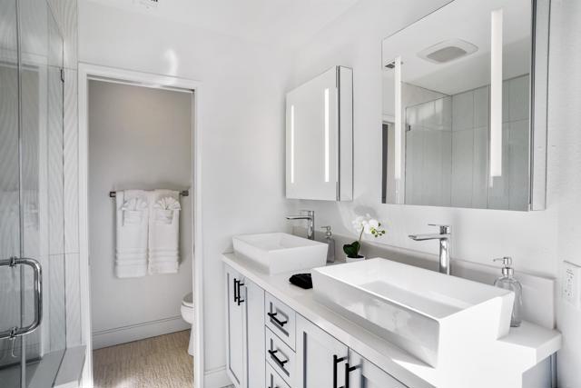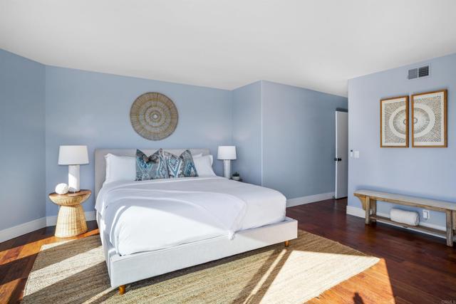 Exclusive Cardiff by the Sea home with panoramic ocean views of Cardiff Beach and San Elijo Lagoon. Ocean views from every room, including the roof top deck. Renovated kitchen with Quartz counter tops, custom cabinets and Thermador appliances. Custom stone fireplace in living room with ocean view balcony. All natural wood floors throughout. Primary bedroom comes with 2 walk in closets, ocean view balcony and direct access to your roof top deck area. Entry is on 2nd floor where you will find your main living area with kitchen, dining and living room. Upstairs is the primary bedroom and downstairs you will find 2 additional bedrooms, full bath and laundry room. 2 car attached garage with access from back alley area. Fabulous neighborhood, within walking distance of the San Elijo Lagoon trails, downtown Cardiff, beaches and many shops and restaurants.