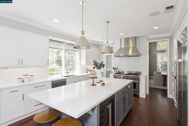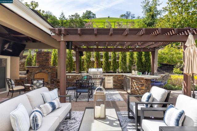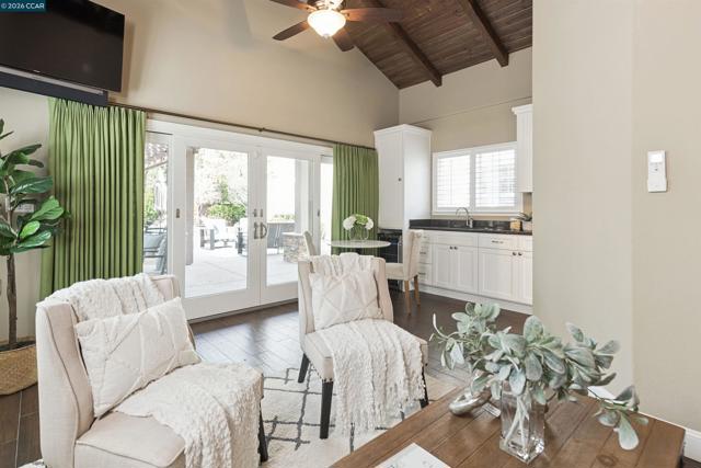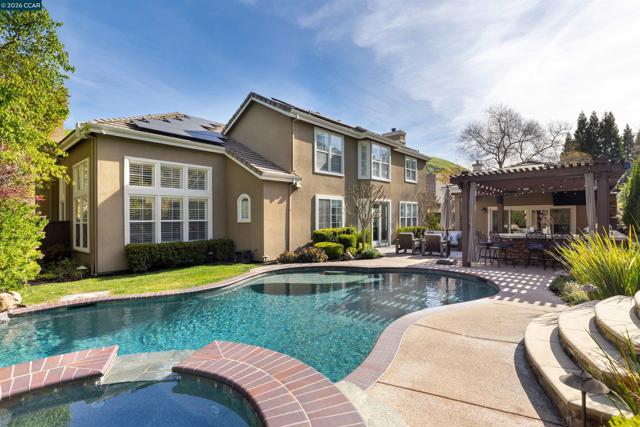 Beautiful 5 bedroom 4 bath home located on sought-after Serafix Road in Alamo. Full bedroom and bath downstairs. Tastefully remodeled with attention to detail. Gourmet kitchen with a stunning center island surrounded by top end appliances, including Wolf stove, Wolf oven, Sub Zero refrigerator, and Island wine fridge. Beautiful hard wood floors complemented with high ceilings, recessed lighting and custom architecture, complete with plantation shutters. The main upstairs bedroom and bathroom are exquisite with every attention to detail. This home is perfect for entertaining indoors and out. Newly refinished pool area featuring full outdoor kitchen and firepit. Pool house ADU with full bathroom and interior kitchen area. Tile roof, three car garage with ample storage. Enjoy the benefits of owned Solar, allowing potentially continuous power with a dedicated backup battery located in garage. Smart features throughout including hard wired cameras, ring doorbell, climate control, and entertainment. East access to downtown, open space and trails. Close proximity to Livorna entrance at 680, BART, shopping, award winning SRVUSD schools, and downtown Alamo Plaza.