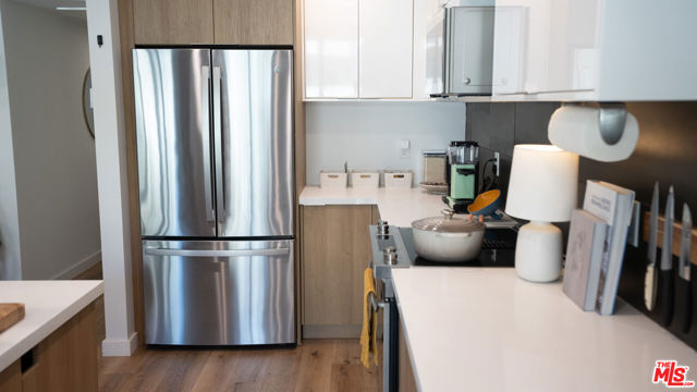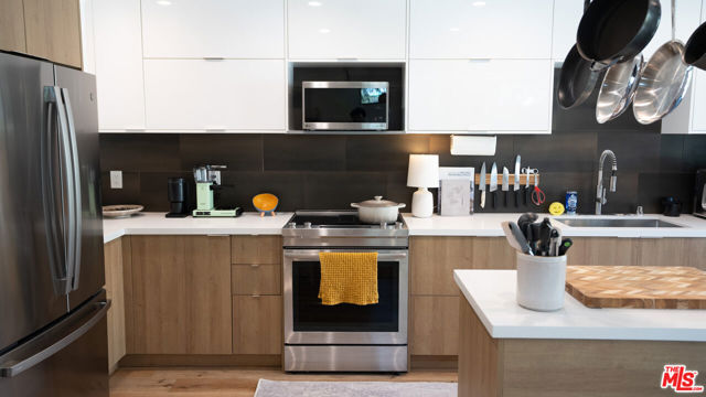 Located in one of Silver Lake's few truly architectural mid-century buildings, this fully reimagined 2-bedroom, 2-bath residence offers thoughtful design and seamless indoor-outdoor living. Renovated and expanded in 2022, the home balances modern functionality with the calm, intentional feel of classic California modernism. The open living space is anchored by three oversized floor-to-ceiling sliding glass doors that connect directly to the garden, filling the interior with soft eastern morning light. Clean lines, warm materials, and intuitive layout make the space feel both expansive and comfortable. The kitchen offers exceptional storage and workspace, designed for everyday practicality without sacrificing aesthetic simplicity. Both bedrooms are well proportioned, while the primary suite features an oversized en-suite bath and generous closet space. Additional amenities include in-unit washer and dryer, two gated parking spaces with EV charging, solar, and high-speed internet included. The building is carefully maintained by an attentive owner, allowing for direct communication without the typical management company layer. Ideally positioned just minutes from the Silver Lake Reservoir and steps from neighborhood favorites including Forage, Edendale, Broom Street Coffee, Gelson's, and Whole Foods. A rare opportunity to live in a thoughtfully designed home within one of Silver Lake's most architecturally distinctive buildings.