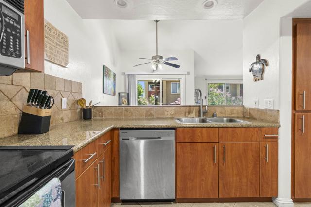 Welcome to this beautifully upgraded top-floor, end-unit condo located in the heart of San Diego’s desirable College East neighborhood—just minutes from SDSU, Lake Murray, and the 70th Street trolley. This bright and airy 2-bedroom, 2-bath residence features vaulted ceilings, sleek laminate flooring throughout, and a fully remodeled kitchen complete with granite countertops and stainless steel appliances. Thoughtful upgrades include recessed lighting, mirrored closet doors, and modern finishes throughout. The open-concept floor plan creates a seamless flow from the living space to a private balcony, perfect for enjoying San Diego’s year-round sunshine. Additional highlights include in-unit laundry, ductless Mini-Split A/C, ceiling fans, and a dedicated covered parking space. Situated within the secure, gated Saranac Villas community, this move-in-ready home is ideal for professionals, SDSU students or staff, or anyone seeking low-maintenance living with unbeatable access to urban conveniences and nearby outdoor recreation. A rare opportunity combining style, location, and comfort—don’t miss it.