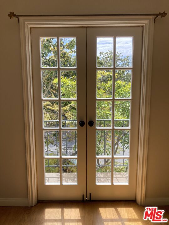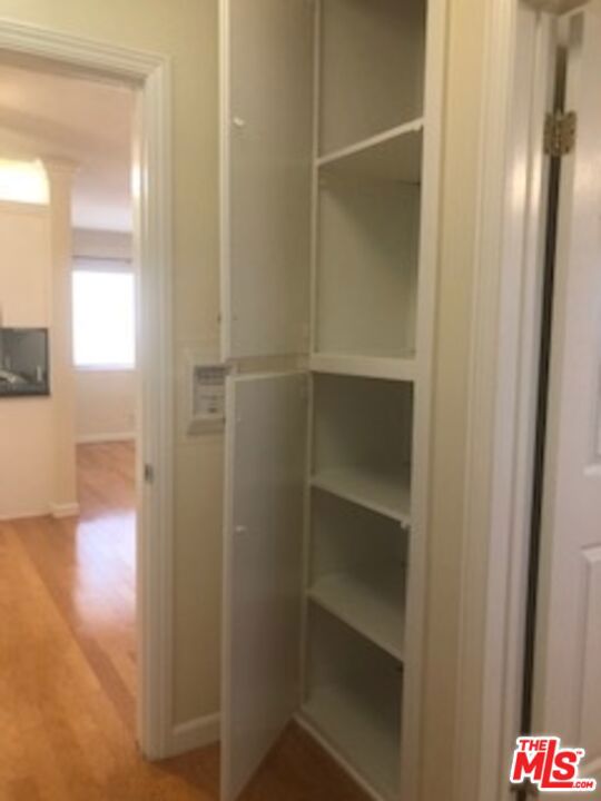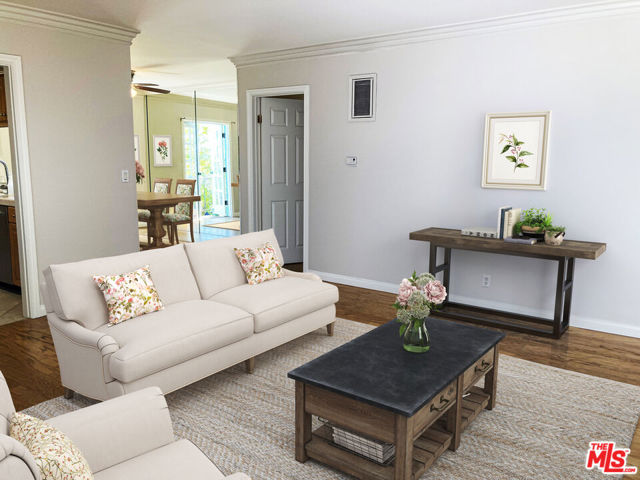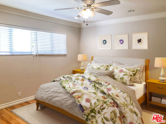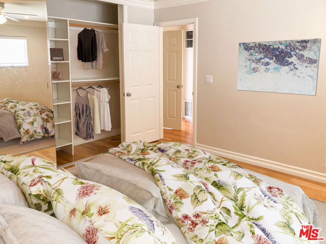 Fabulous Private front unit with lots of windows for light, spacious living & dining room. Galley kitchen With granite countertops & stainless steel appliances. Master bedroom with ensuite walk-in shower & wall to wall custom closet. Large second bedroom with wall to wall custom closet. Ceiling fans, hallway separates bedrooms with floor to ceiling linen cabinet & beautiful hardwood floors throughout. Only one common wall. One car parking. Quite boutique building. Close to grocery store, shopping, coffee houses, restaurants, metro, 3rd Street Promenade, Pacific Ocean, and Palisades Park . Butterfly Intercom System - Secured Entrance. Virtually Staged. Must see!