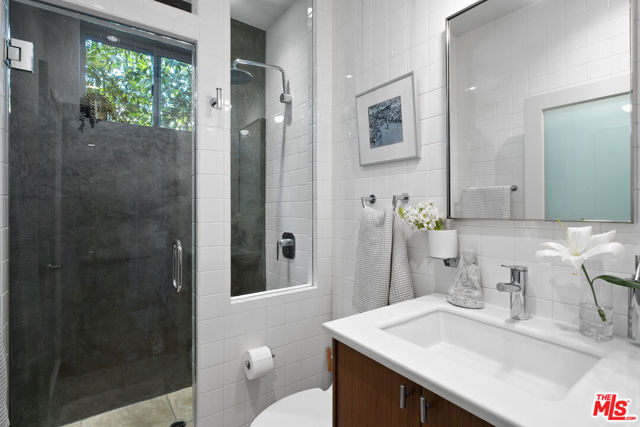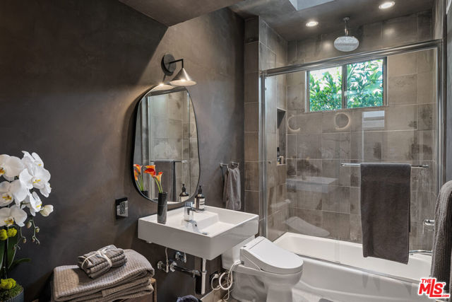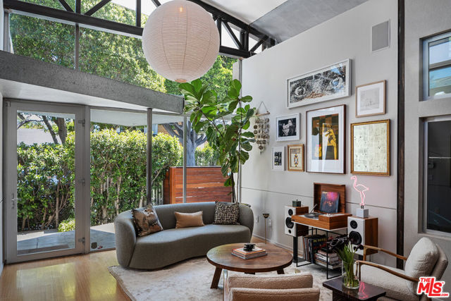 Located perfectly, this modern 4 bedroom home is close to Beverly Hills in the West Hollywood arts and restaurant district. Uniquely designed, with a curved steel 18" ceiling entry that it is filled with natural light while it sits behind wooden gates and tall hedges. At the entry, the living room and dining room are separated by an imposing fireplace. Down the hall is the sleek chef's kitchen with a den that opens up to spacious deck with built-in single touch gas heaters suspended over additional lounging areas next to a dipping pool and spa. The outdoor kitchen with separate changing room and shower compliments the entertainment area. All this is surrounded by tall hedges for ultimate privacy. 3 bedrooms with 2 baths are on the lower level of the home while the suite takes up the entire upper floor the home which includes a separate office with fireplace, large walk-in closet and a balconies.