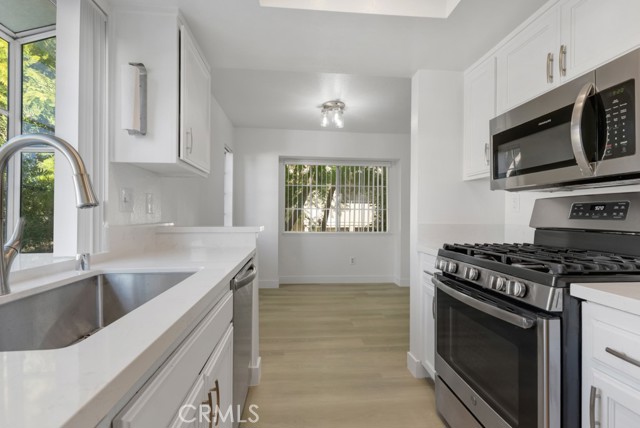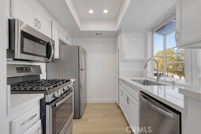 Prime Calabasas Living Behind Gates! Welcome home to this beautifully remodeled 2-bedroom, 2-bath upstairs condo situated in a desirable gated community! Step inside to find brand-new flooring and fresh paint throughout, complementing the bright, open floor plan. The updated kitchen features quartz countertops and stainless steel appliances—including a stove, oven, microwave, dishwasher, and refrigerator—overlooking a peaceful greenbelt and trees! The spacious primary suite offers a newly upgraded ensuite bathroom, walk-in closet, and serene ambiance. The secondary bedroom also enjoys its own refreshed bathroom with a brand-new vanity. Enjoy a comfortable dining area, generous living room, and a private balcony perfect for morning coffee or unwinding among the trees. Additional conveniences include in-unit washer and dryer, central AC/heat, and two covered side-by-side parking spaces. Residents have access to fantastic amenities including a sparkling swimming pool, relaxing jacuzzi, and fitness room. All of this in a prime location — just minutes to the beach, freeway access, markets, trendy restaurants, shops, and entertainment. A rare opportunity to live stylishly and comfortably in Calabasas! Located in the amazing Las Virgenes school District!
