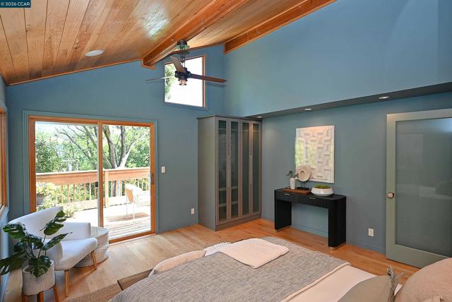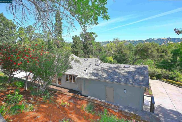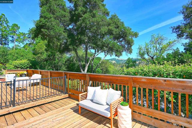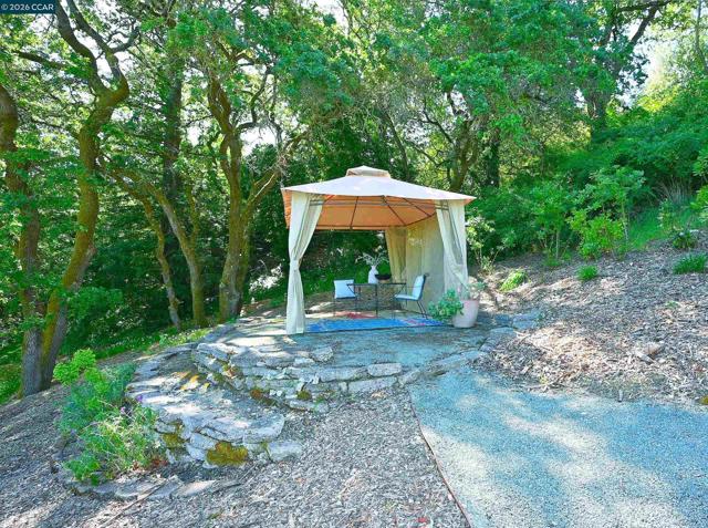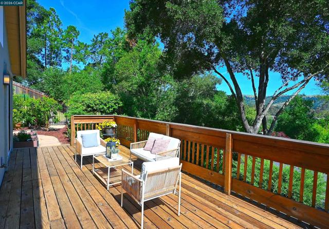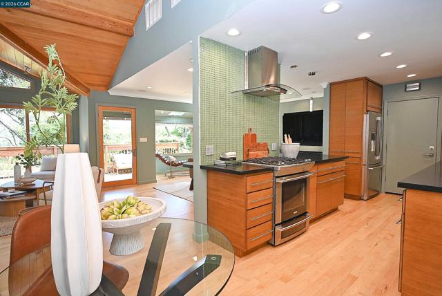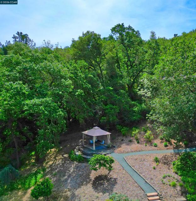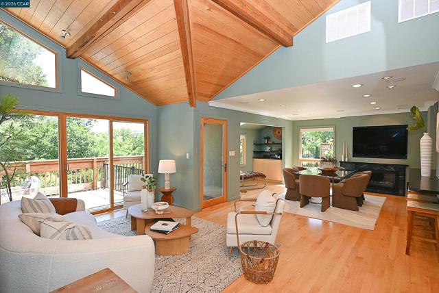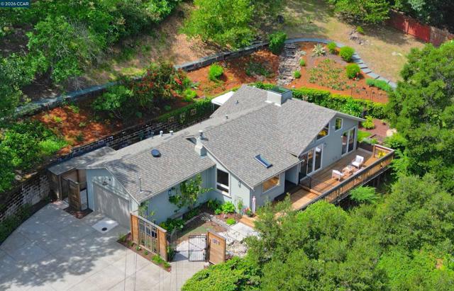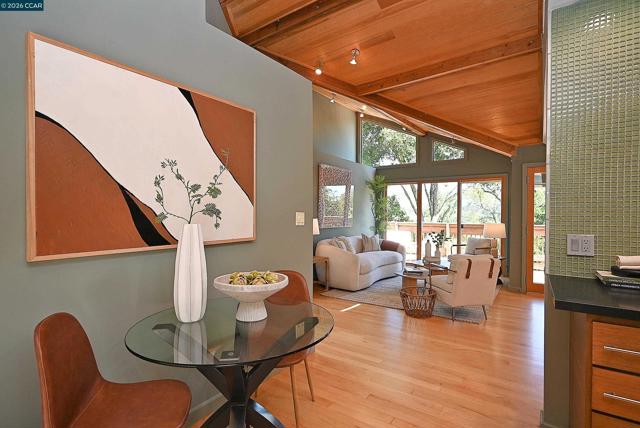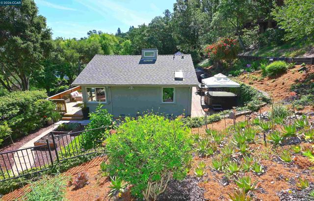 Tucked among the trees in Lafayette is this custom modern home with seamless indoor-outdoor flow, rebuilt from the studs in 2011 with new electrical, plumbing, a tankless water heater, and air conditioning. Vaulted wood ceilings, expansive windows, and open living spaces lead to large decks with tranquil tree views, creating ideal indoor-outdoor living with multiple sitting and entertaining areas. The kitchen features honed black granite counters, a gas stove, custom bamboo cabinets, and all appliances included. Public records show 1 bedroom and 1 bath, but an additional room functions as a second bedroom; it has a window and closet. The home includes tv surround sound and music speakers in all rooms, recessed lighting, and art spotlights. Fully landscaped grounds feature a spa on the back deck, a gazebo sitting area, a rock waterfall, a tool shed, a garden, and several private spaces to relax and enjoy nature. A new sewer line was installed in 2023, and the seller has plans for a potential additional home, adding flexibility and future opportunity. Check out Zillow Showcase for virtual floor plan, staging options and more! ** Open Tues (April 21) 10-1pm.**