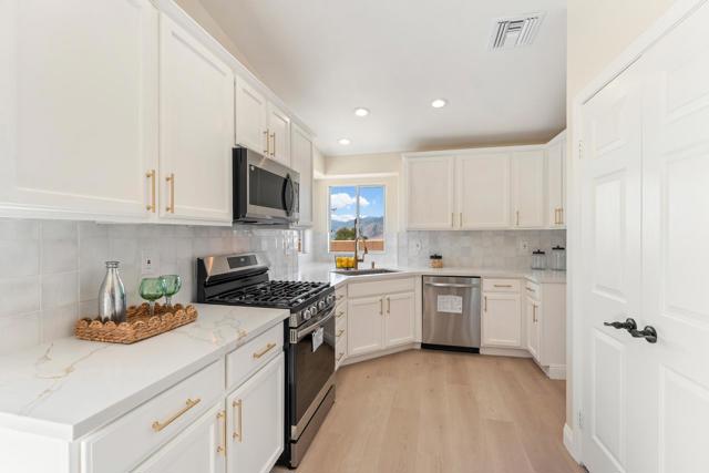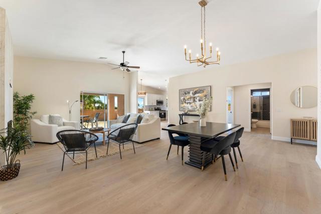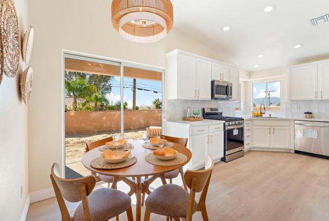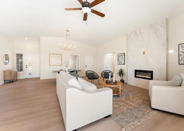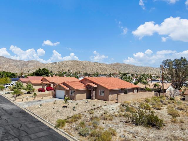 Fully remodeled with a designer's touch, this stunning home in the Highlands of Desert Hot Springs offers exceptional quality, style, and breathtaking panoramic mountain and valley views--arguably one of the best view locations in the area. This better-than-new residence features a flexible floor plan allowing for up to 4 bedrooms and 2 beautifully upgraded bathrooms, ideal for both comfortable living and investment potential. The open great room concept creates a seamless flow for both formal and informal living, while the split floor plan provides added privacy for the primary suite. Interior highlights include beautiful upgraded flooring throughout, a remodeled primary bathroom with a custom tiled shower, and a stylish guest bath with new vanities and resort-style finishes. The fully upgraded kitchen is a true showpiece, featuring new appliances, quality cabinetry, quartz countertops, and a designer backsplash. A recently added electric tiled fireplace creates a striking focal point in the living area and is sure to impress. Step outside to a spacious approximately 400 sq ft covered patio--perfect for entertaining or relaxing while enjoying the incredible views. Additional features include a block privacy wall, RV parking, and generous outdoor space. This rare view property is priced to move and presents an excellent opportunity for a value-conscious buyer or investor seeking strong potential returns.